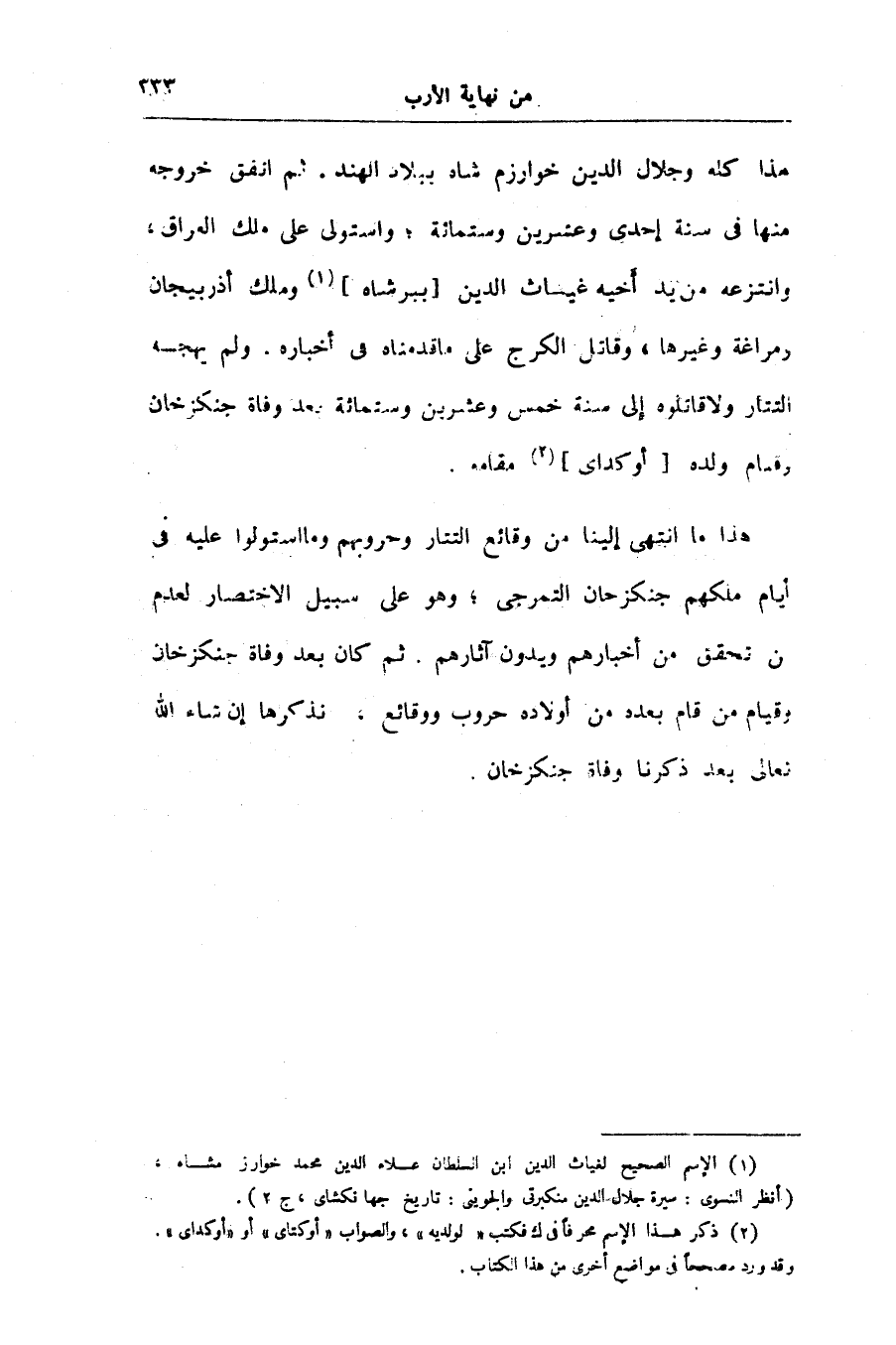 هذا ما انتهى إلينا من وقائع التتار وحروبهم وما استولوا عليه فى أيام ملكهم جنكزخان التمرجى؛ وهو على سبيل الاختصار لعدم من تحقق من أخبارهم ويدون آثارهم. ثم كان بعد وفاة جنكزخان وقيام من قام بعده من أولاده حروب ووقائع، نذكرها إن شاء الله تعالى بعد ذكرنا وفاة جنكزخان.
