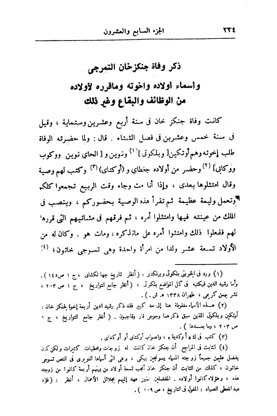 ذكر وفاة جنكزخان التمرجى وأسماء أولاده واخوته وما قرره لأولاده من الوظائف والبقاع وغير ذلك