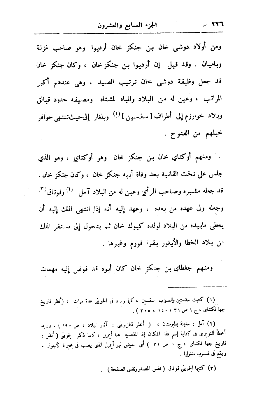 ومنهم أوكتاى خان بن جنكزخان وهو أوكتاى، وهو الذى جلس على تخت القانية بعد وفاة أبيه جنكزخان، وكان جنكزخان، قد جعله مشيره وصاحب الرأى وعين له من البلاد آمل «2» وقوتاق «3» وجعله ولى عهده من بعده، وعهد إليه أنه إذا انتهى الملك إليه أن يعطى ما بيده من البلاد لولده كيوك خان ثم يتحول إلى مستقر الملك من بلاد الخطا والأيغور بقرا قورم وغيرها.