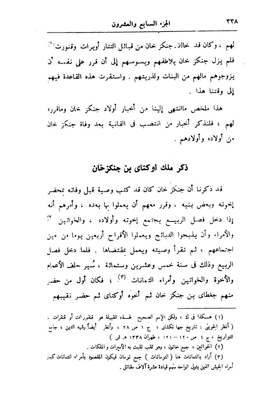 هذا ملخص ما انتهى إلينا من أخبار أولاد جنكزخان وما قرره لهم؛ فلنذكر أخبار من انتصب فى القانية بعد وفاة جنكزخان من أولاده وأولادهم.