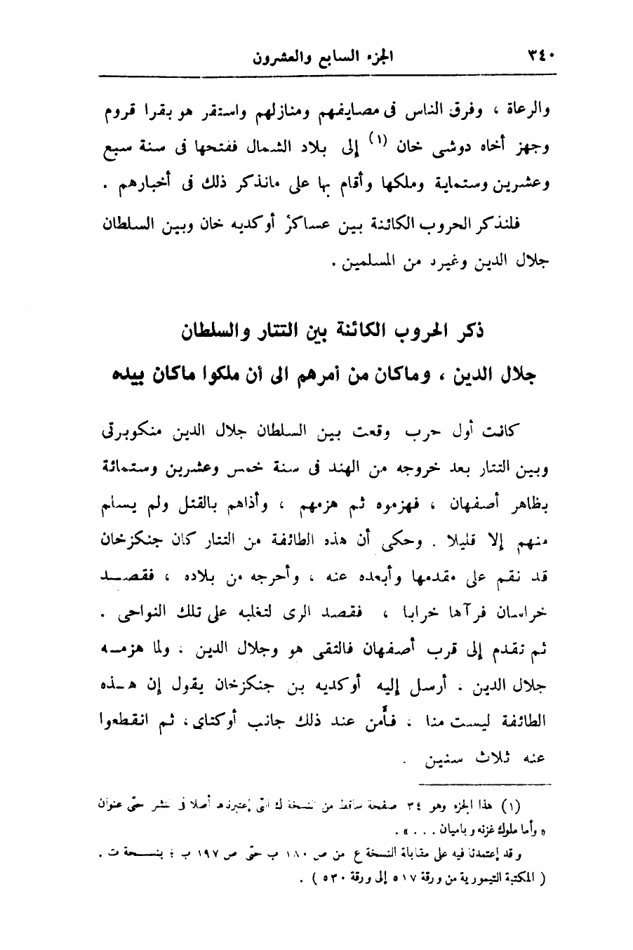 فلنذكر الحروب الكائنة بين عساكر أوكديه خان وبين السلطان جلال الدين وغيره من المسلمين.