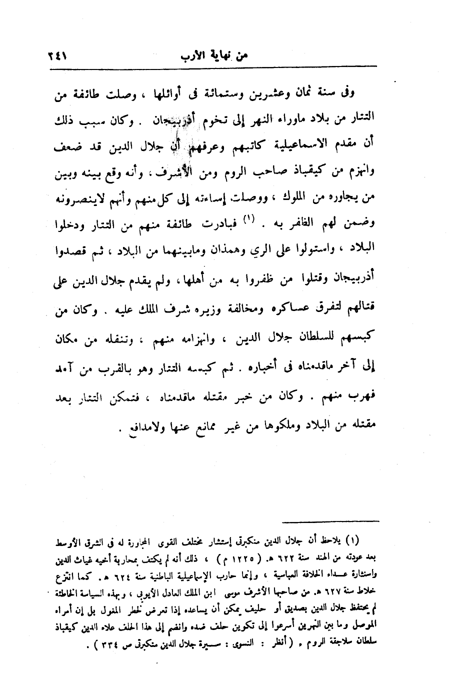 وفى سنة ثمان وعشرين وستمائة فى أوائلها، وصلت طائفة من التتار من بلاد ما وراء النهر إلى تخوم أذربيجان. وكان سبب ذلك أن مقدم الاسماعيلية كاتبهم وعرفهم أن جلال الدين قد ضعف وانهزم من كيقباذ صاحب الروم ومن الأشرف، وأنه وقع بينه وبين من يجاوره من الملوك، ووصلت إساءته إلى كل منهم وأنهم لا ينصرونه وضمن لهم الظفر به. «1» فبادرت طائفة منهم من التتار ودخلوا البلاد، واستولوا على الرى وهمذان وما بينهما من البلاد، ثم قصدوا أذربيجان وقتلوا من ظفروا به من أهلها، ولم يقدم جلال الدين على قتالهم لتفرق عساكره ومخالفة وزيره شرف الملك عليه. وكان من كبسهم للسلطان جلال الدين، وانهزامه منهم، وتنقله من مكان إلى آخر ما قدمناه فى أخباره. ثم كبسه التتار وهو بالقرب من آمد فهرب منهم. وكان من خبر مقتله ما قدمناه، فتمكن التتار بعد مقتله من البلاد وملكوها من غير ممانع عنها ولا مدافع.