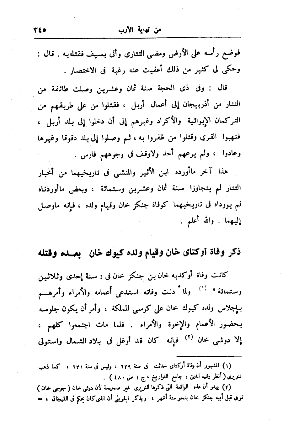 قال: وفى ذى الحجة سنة ثمان وعشرين وصلت طائفة من التتار من أذربيجان إلى أعمال أربل، فقتلوا من على طريقهم من التركمان الإيوائية والأكراد وغيرهم إلى أن دخلوا إلى بلد أربل، فنهبوا القرى وقتلوا من ظفروا به، ثم وصلوا إلى بلد دقوقا وغيرها وعادوا، ولم يرعهم أحد ولا وقف فى وجوههم فارس.