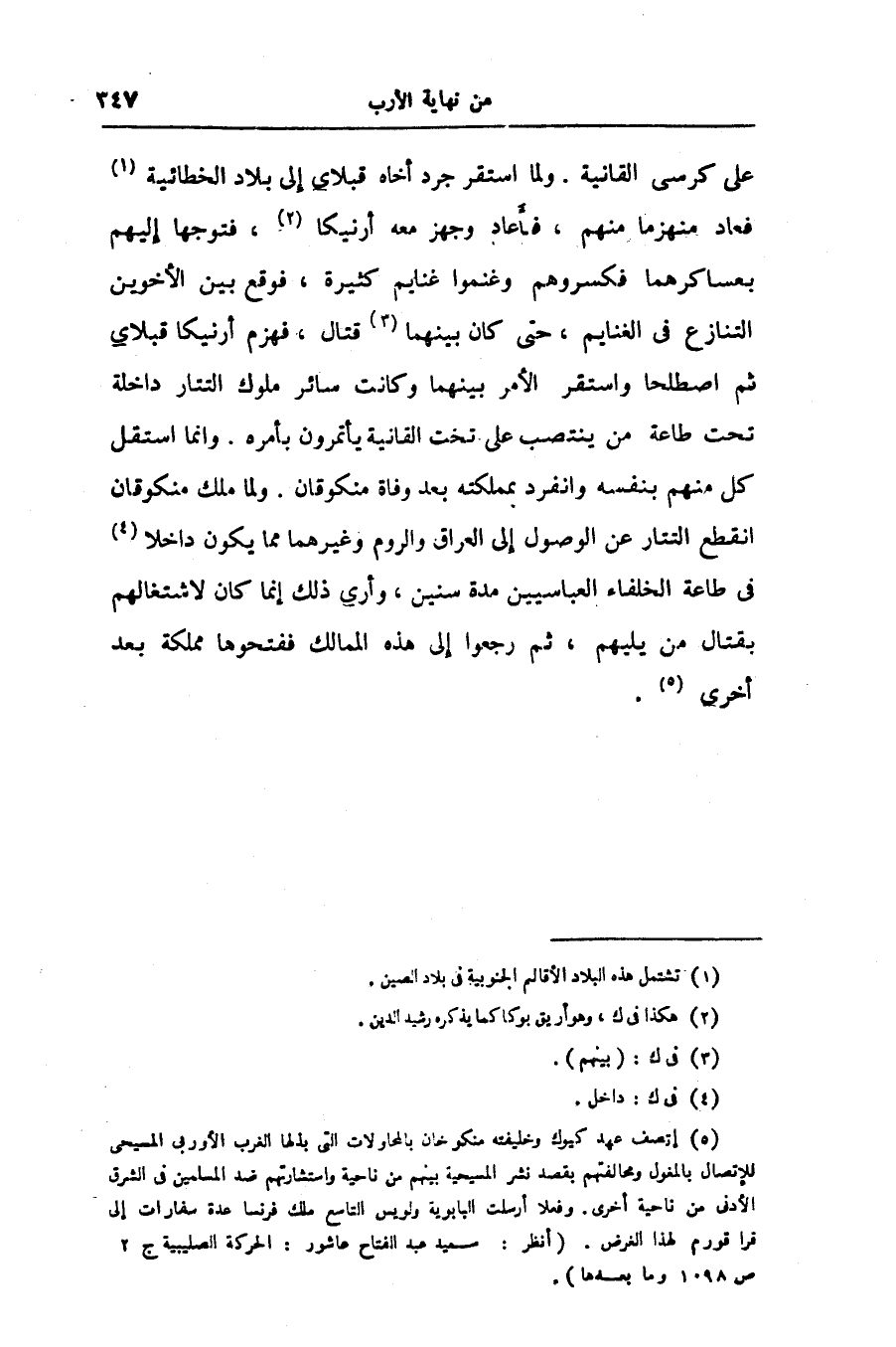 على كرسى القانية. ولما استقر جرد أخاه قبلاى إلى بلاد الخطائية «1» فعاد منهزما منهم، فأعاد وجهز معه أرنيكا «2» ، فتوجها إليهم بعساكرهما فكسروهم وغنموا غنايم كثيرة، فوقع بين الأخوين التنازع فى الغنايم، حتى كان بينهما «3» قتال، فهزم أرنيكا قبلاى ثم اصطلحا واستقر الأمر بينهما وكانت سائر ملوك التتار داخلة تحت طاعة من ينتصب على تخت القانية يأتمرون بأمره. وانما استقل كل منهم بنفسه وانفرد بمملكته بعد وفاة منكوقان. ولما ملك منكوقان انقطع التتار عن الوصول إلى العراق والروم وغيرهما مما يكون داخلا «4» فى طاعة الخلفاء العباسيين مدة سنين، وأرى ذلك إنما كان لاشتغالهم بقتال من يليهم، ثم رجعوا إلى هذه الممالك ففتحوها مملكة بعد أخرى «5» .