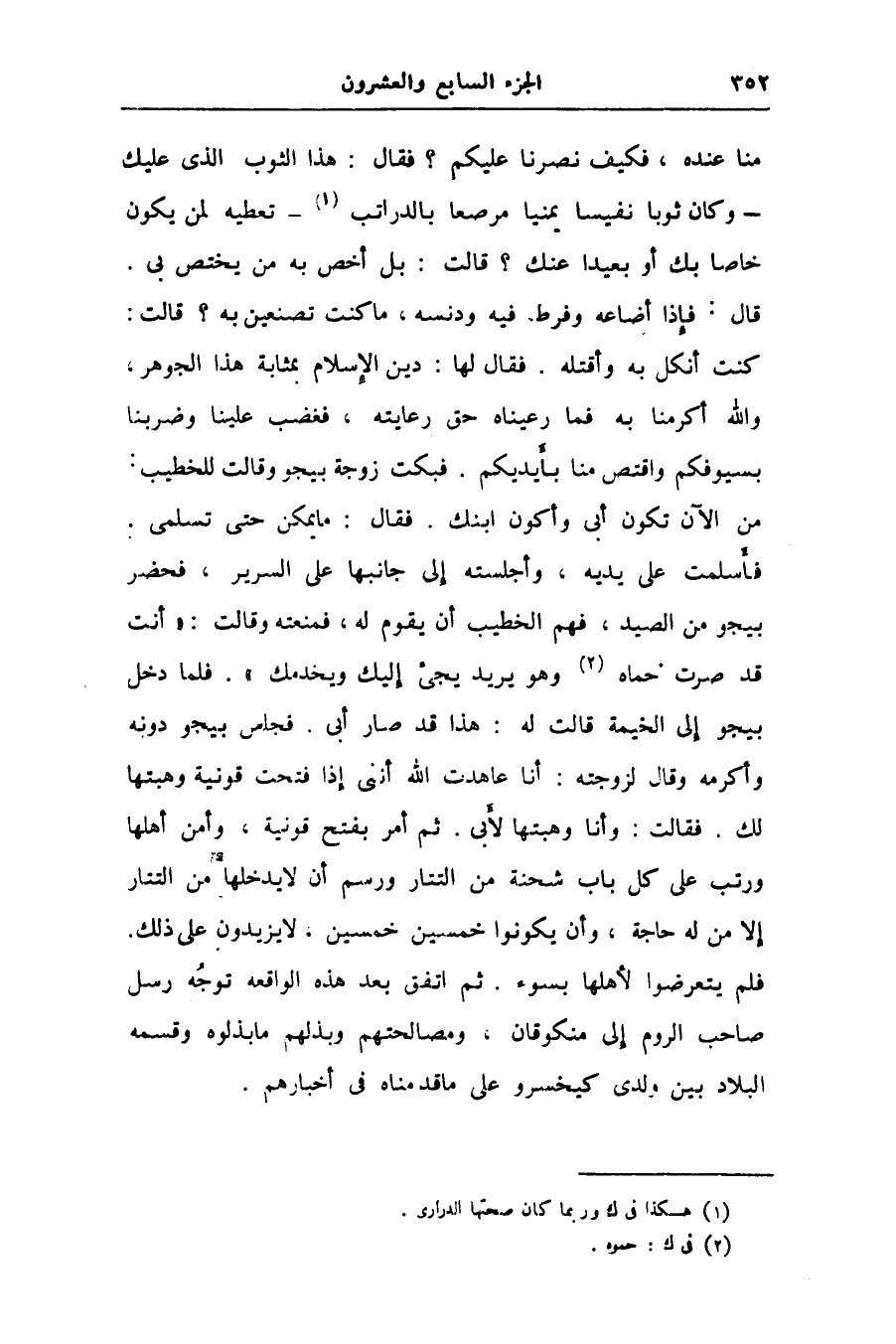 كنت أنكل به وأقتله. فقال لها: دين الإسلام بمثابة هذا الجوهر، والله أكرمنا به فما رعيناه حق رعايته، فغضب علينا وضربنا بسيوفكم واقتص منا بأيديكم. فبكت زوجة بيجو وقالت للخطيب: