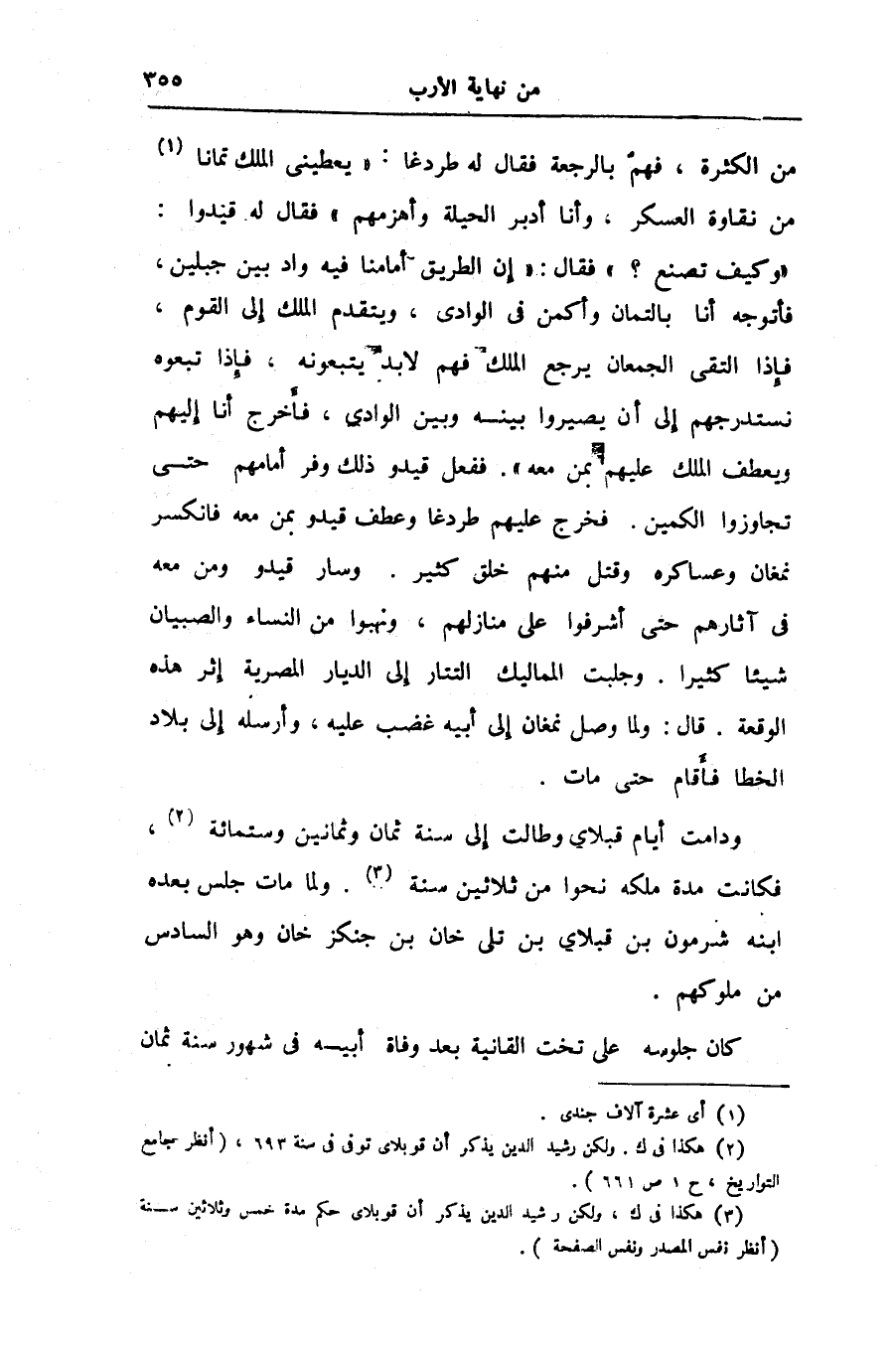 «وكيف تصنع؟» فقال: «إن الطريق أمامنا فيه واد بين جلبين، فأتوجه أنا بالتمان وأكمن فى الوادى، ويتقدم الملك إلى القوم، فإذا التقى الجمعان يرجع الملك فهم لا بد يتبعونه، فإذا تبعوه نستدرجهم إلى أن يصيروا بينه وبين الوادى، فأخرج أنا إليهم ويعطف الملك عليهم بمن معه» . ففعل قيدو ذلك وفر أمامهم حتى تجاوزوا الكمين. فخرج عليهم طردغا وعطف قيدو بمن معه فانكسر نمغان وعساكره وقتل منهم خلق كثير. وسار قيدو ومن معه فى آثارهم حتى أشرفوا على منازلهم، ونهبوا من النساء والصبيان شيئا كثيرا. وجلبت المماليك التتار إلى الديار المصرية إثر هذه الوقعة. قال: ولما وصل نمغان إلى أبيه غضب عليه، وأرسله إلى بلاد الخطا فأقام حتى مات.
