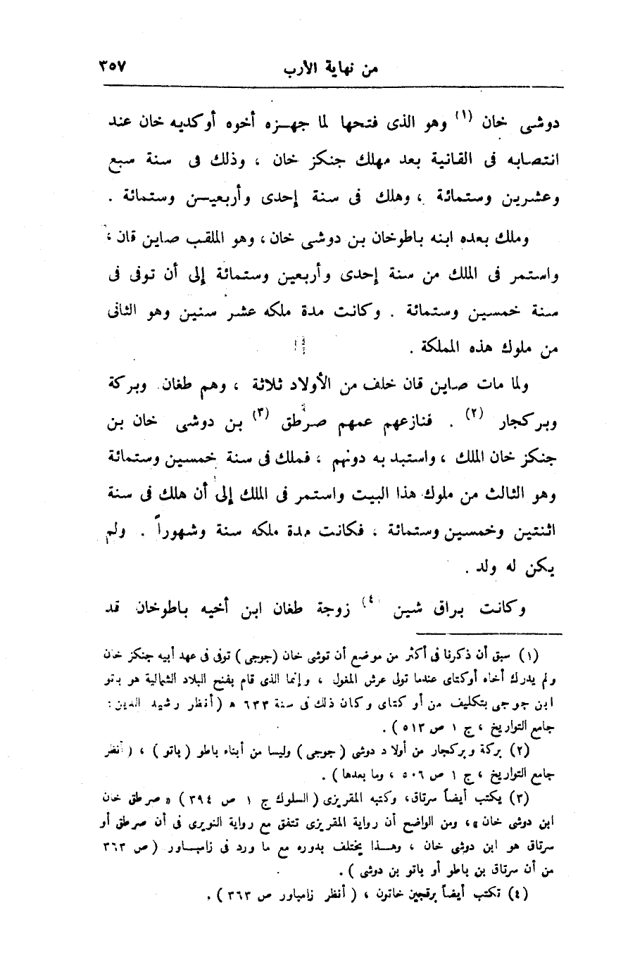 ولما مات صاين قان خلف من الأولاد ثلاثة، وهم طغان وبركة وبركجار «2» . فنازعهم عمهم صرطق «3» بن دوشى خان بن جنكزخان الملك، واستبد به دونهم، فملك فى سنة خمسين وستمائة وهو الثالث من ملوك هذا البيت واستمر فى الملك إلى أن هلك فى سنة اثنتين وخمسين وستمائة، فكانت مدة ملكه سنة وشهورا. ولم يكن له ولد.