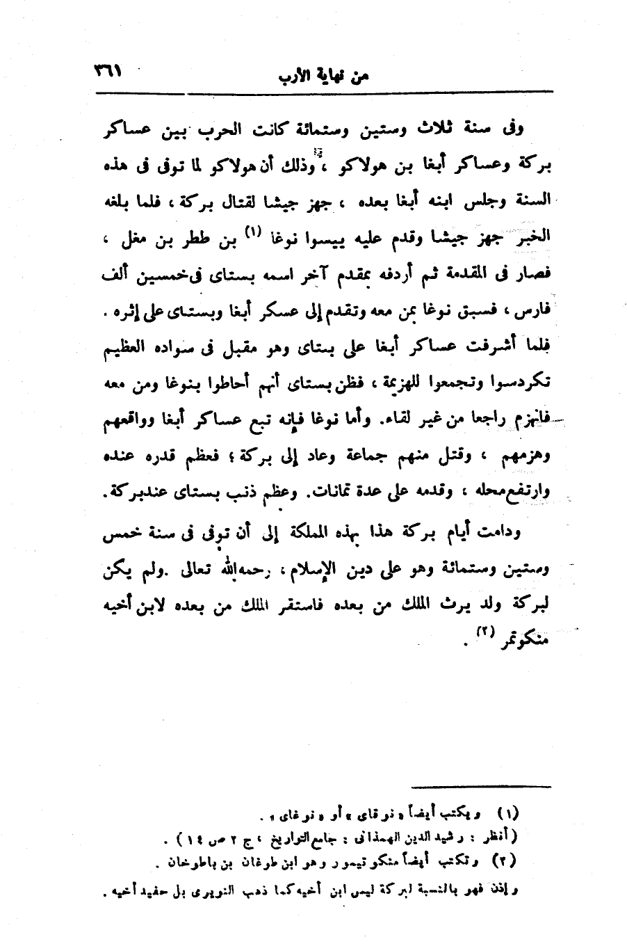 وفى سنة ثلاث وستين وستمائة كانت الحرب بين عساكر بركة وعساكر أبغا بن هولاكو، وذلك أن هولاكو لما توفى فى هذه السنة وجلس ابنه أبغا بعده، جهز جيشا لقتال بركة، فلما بلغه الخبر جهز جيشا وقدم عليه ييسوا نوغا «1» بن ططر بن مغل، فصار فى المقدمة ثم أردفه بمقدم آخر اسمه بستاى فى خمسين ألف فارس، فسبق نوغا بمن معه وتقدم إلى عسكر أبغا وبستاى على إثره.