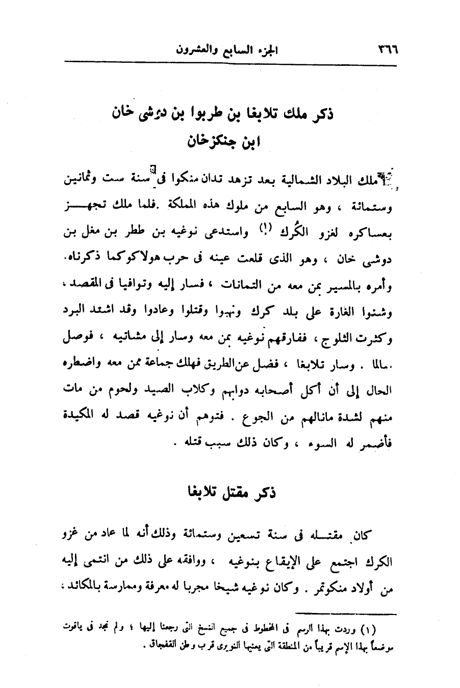 وأمره بالمسير بمن معه من التمانات، فسار إليه وتوافيا فى المقصد، وشنوا الغارة على بلد كرك ونهبوا وقتلوا وعادوا وقد اشتد البرد وكثرت الثلوج، ففارقهم نوغيه بمن معه وسار إلى مشاتيه، فوصل سالما. وسار تلابغا، فضل عن الطريق فهلك جماعة ممن معه واضطره الحال إلى أن أكل أصحابه دوابهم وكلاب الصيد ولحوم من مات منهم لشدة ما نالهم من الجوع. فتوهم أن نوغيه قصد له المكيدة فأضمر له السوء، وكان ذلك سبب قتله.