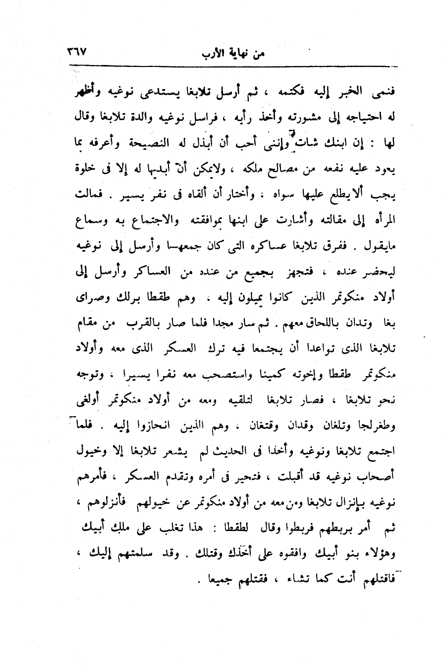 فنمى الخبر إليه فكتمه، ثم أرسل تلابغا يستدعى نوغيه وأظهر له احتياجه إلى مشورته وأخذ رأيه، فراسل نوغيه والدة تلابغا وقال لها: إن ابنك شات وإننى أحب أن أبذل له النصيحة وأعرفه بما يعود عليه نفعه من مصالح ملكه، ولا يمكن أن أبديها له إلا فى خلوة يجب ألا يطلع عليها سواه، وأختار أن ألقاه فى نفر يسير. فمالت المرأه إلى مقالته وأشارت على ابنها بموافقته والاجتماع به وسماع ما يقول. ففرق تلابغا عساكره التى كان جمعها وأرسل إلى نوغيه ليحضر عنده، فتجهز بجميع من عنده من العساكر وأرسل إلى أولاد منكوتمر الذين كانوا يميلون إليه، وهم طقطابرلك وصراى بغا وتدان باللحاق معهم. ثم سار مجدا فلما صار بالقرب من مقام تلابغا الذى تواعدا أن يجتمعا فيه ترك العسكر الذى معه وأولاد منكوتمر طقطا وإخوته كمينا واستصحب معه نفرا يسيرا، وتوجه نحو تلابغا، فصار تلابغا لتلقيه ومعه من أولاد منكوتمر أولغى وطغرلجا وتلغان وقدان وقتغان، وهم الذين انحازوا إليه. فلما اجتمع تلابغا ونوغيه وأخذا فى الحديث لم يشعر تلابغا إلا وخيول أصحاب نوغيه قد أقبلت، فتحير فى أمره وتقدم العسكر، فأمرهم نوغيه بإنزال تلابغا ومن معه من أولاد منكوتمر عن خيولهم فأنزلوهم، ثم أمر بربطهم فربطوا وقال لطقطا: هذا تغلب على ملك أبيك وهؤلاء بنو أبيك وافقوه على أخذك وقتلك. وقد سلمتهم إليك، فاقتلهم أنت كما تشاء، فقتلهم جميعا.