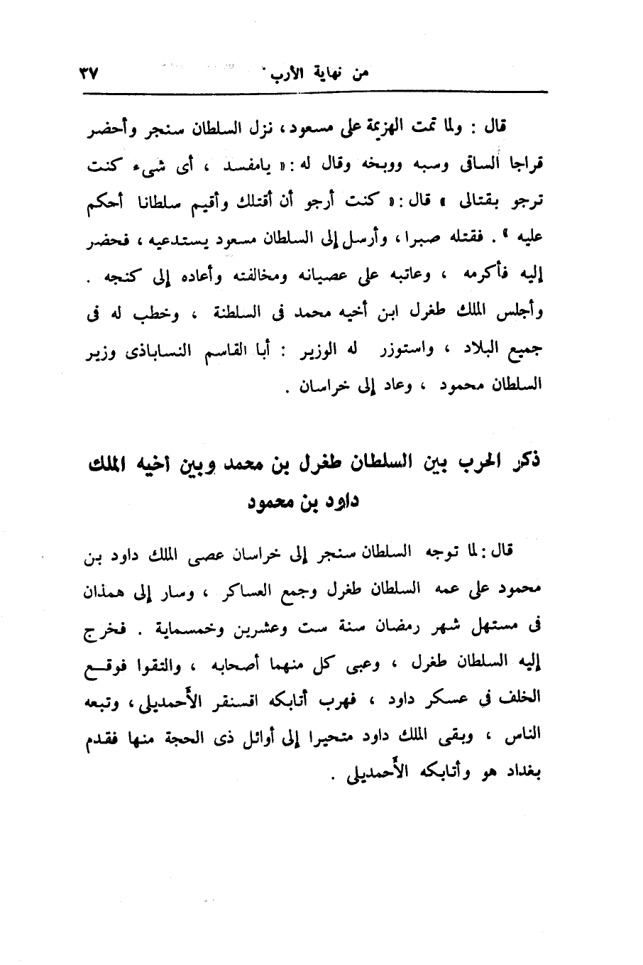 وأجلس الملك طغرل ابن أخيه محمد فى السلطنة، وخطب له فى جميع البلاد، واستوزر له الوزير: أبا القاسم النساباذى وزير السلطان محمود، وعاد إلى خراسان.