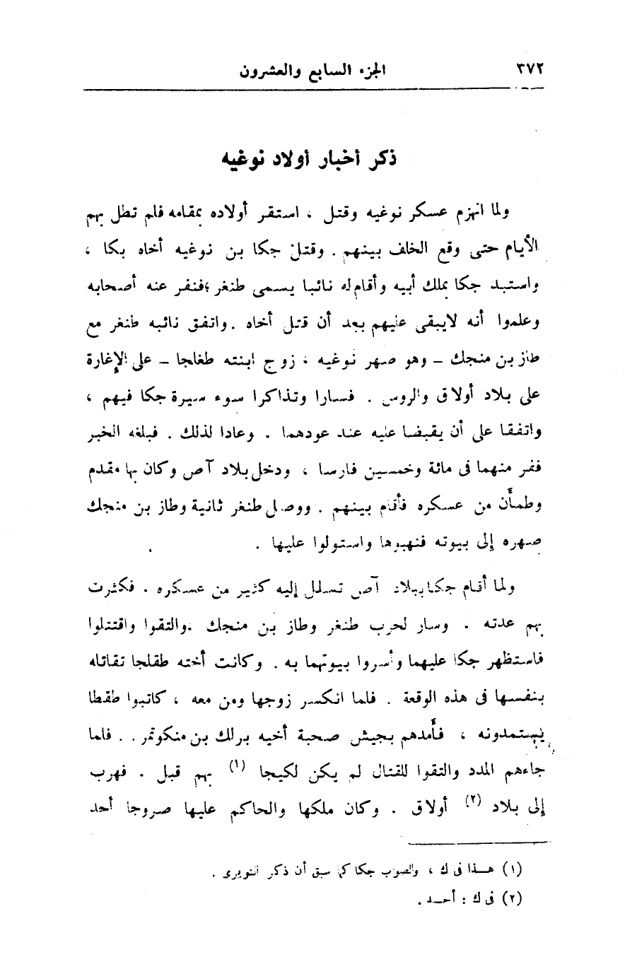 ولما انهزم عسكر نوغيه وقتل، استقر أولاده بمقامه فلم تطل بهم الأيام حتى وقع الخلف بينهم. وقتل جكا بن نوغيه أخاه بكا، واستبد جكا بملك أبيه وأقام له نائبا يسمى طنغر؛ فنفر عنه أصحابه وعلموا أنه لا يبقى عليهم بعد أن قتل أخاه. واتفق نائبه طنغر مع طاز بن منجك- وهو صهر نوغيه، زوج ابنته طغلجا- على الإغارة على بلاد أولاق والروس. فسارا وتذاكرا سوء سيرة جكا فيهم، واتفقا على أن يقبضا عليه عند عودهما، وعادا لذلك. فبلغه الخبر ففر منهما فى مائة وخمسين فارسا، ودخل بلاد آص وكان بها مقدم وطمأن من عسكره فأقام بينهم. ووصل طنغر ثانية وطاز بن منجك صهره إلى بيوته فنهبوها واستولوا عليها.
