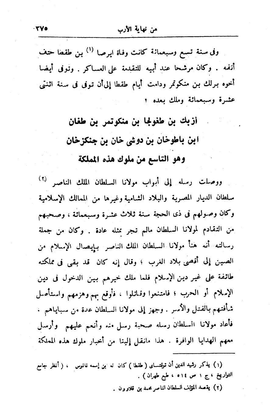 ووصلت رسله إلى أبواب مولانا السلطان الملك الناصر «2» سلطان الديار المصرية والبلاد الشامية وغيرها من الممالك الإسلامية وكان وصولهم فى ذى الحجة سنة ثلاث عشرة وسبعمائة، وصحبهم من التقادم لمولانا السلطان ما لم تجر بمثله عادة. وكان من جملة رسالته أنه هنأ مولانا السلطان الملك الناصر بإيصال الإسلام من الصين إلى أقصى بلاد الغرب؛ وقال إنه كان قد بقى فى مملكته طائفة على غير دين الإسلام فلما ملك خيرهم بين الدخول فى دين الإسلام أو الحرب؛ فامتنعوا وقاتلوا، فأوقع بهم وهزمهم واستأصل شأفتهم بالقتل والأسر. وجهز إلى مولانا السلطان عدة من سباياهم، فأعاد مولانا السلطان رسله صحبة رسل منه وأنعم عليهم وأرسل معهم الهدايا الوافرة. هذا ما نقل إلينا من أخبار ملوك هذه المملكة