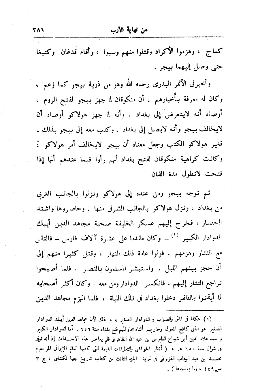 ثم توجه بيجو ومن عنده إلى هولاكو ونزلوا بالجانب الغربى من بغداد، ونزل هولاكو بالجانب الشرقى منها. وحاصروها واشتد الحصار، فخرج إليهم عسكر الخليفة صحبة مجاهد الدين أيبك الدوادار الكبير «1» - وكان مقدما على عشرة آلاف فارس- فالتقن مع التتار وهزمهم. فولوا عامة ذلك النهار، وقتل كثيرا منهم إلى أن حجز بينهم الليل، واستبشر المسلمون بالنصر. فلما أصبحوا تراجع التتار إليهم، فانكسر الدوادار ومن معه. وكان أكثر أصحابه لما أيقنوا بالظفر دخلوا بغداد فى تلك الليلة، فلما انهزم مجاهد الدين