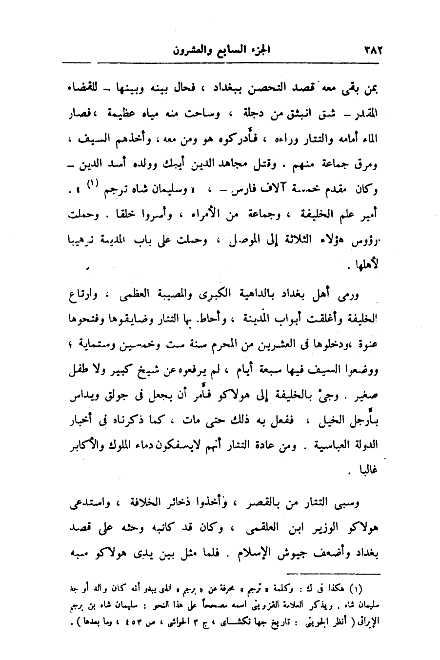 وسبى التتار من بالقصر، وأخذوا ذخائر الخلافة، واستدعى هولاكو الوزير ابن العلقمى، وكان قد كاتبه وحثه على قصد بغداد وأضعف جيوش الإسلام. فلما مثل بين يدى هولاكو سبه