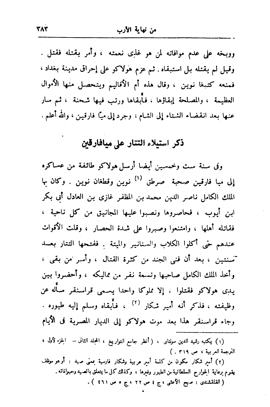 وفى سنة ست وخمسين أيضا أرسل هولاكو طائفة من عساكره إلى ميافارقين صحبة صرطق «1» نوين وقطغان نوين. وكان بها الملك الكامل ناصر الدين محمد بن المظفر غازى بن العادل أبى بكر ابن أيوب، فحاصروها ونصبوا عليها المجانيق من كل ناحية، فقاتله أهلها، وامتنعوا وصبروا على شدة الحصار، وقلت الأقوات عندهم حتى أكلوا الكلاب والسنانير والميتة. ففتحها التتار بعد سنتين، بعد أن فنى الجند من كثرة القتال، وأسر من بقى، وأخذ الملك الكامل صاحبها وتسعة نفر من مماليكه، وأحضروا بين يدى هولاكو فقتلوا، إلا مملوكا واحدا يسمى قراسنقر سأله عن وظيفته، فذكر أنه أمير شكار «2» ، فأبقاه وسلم إليه طيوره.