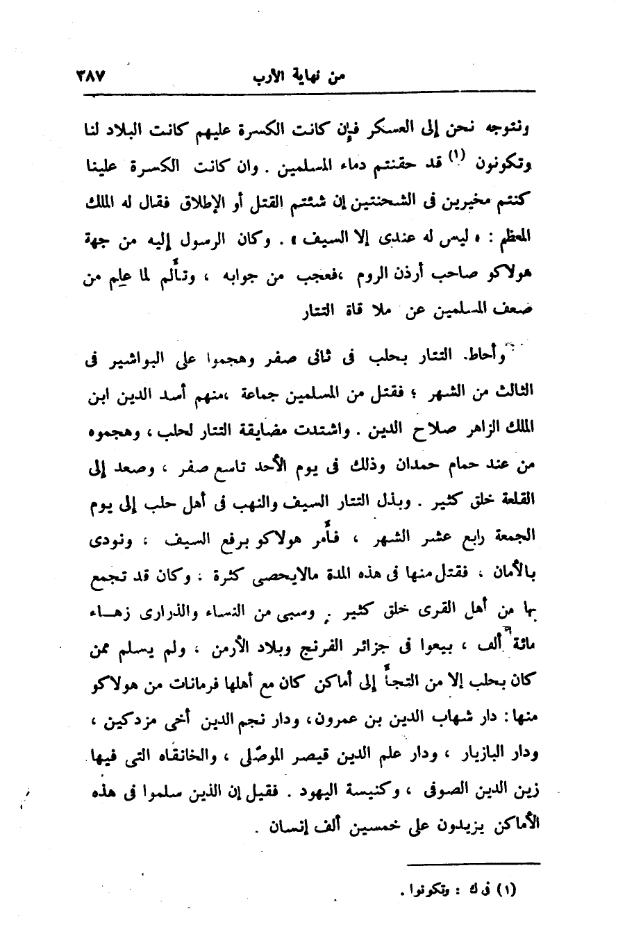 ونتوجه نحن إلى العسكر فإن كانت الكسرة عليهم كانت البلاد لنا وتكونون «1» قد حقنتم دماء المسلمين. وان كانت الكسرة علينا كنتم مخيرين فى الشحنتين إن شئتم القتل أو الإطلاق فقال له الملك المعظم: «ليس له عندى إلا السيف» . وكان الرسول إليه من جهة هولاكو صاحب أرذن الروم، فعجب من جوابه، وتألم لما علم من ضعف المسلمين عن ملاقاة التتار وأحاط التتار بحلب فى ثانى صفر وهجموا على البواشير فى الثالث من الشهر؛ فقتل من المسلمين جماعة، منهم أسد الدين ابن الملك الزاهر صلاح الدين. واشتدت مضايقة التتار لحلب، وهجموه من عند حمام حمدان وذلك فى يوم الأحد تاسع صفر، وصعد إلى القلعة خلق كثير. وبذل التتار السيف والنهب فى أهل حلب إلى يوم الجمعة رابع عشر الشهر، فأمر هولاكو برفع السيف، ونودى بالأمان، فقتل منها فى هذه المدة ما لا يحصى كثرة، وكان قد تجمع بها من أهل القرى خلق كثير. وسبى من النساء والذرارى زهاء مائة ألف، بيعوا فى جزائر الفرنج وبلاد الأرمن، ولم يسلم ممن كان بحلب إلا من التجأ إلى أماكن كان مع أهلها فرمانات من هولاكو منها: دار شهاب الدين بن عمرون، ودار نجم الدين أخى مزدكين، ودار البازيار، ودار علم الدين قيصر الموصّلى، والخانقاه التى فيها زين الدين الصوفى، وكنيسة اليهود. فقيل إن الذين سلموا فى هذه الأماكن يزيدون على خمسين ألف إنسان.