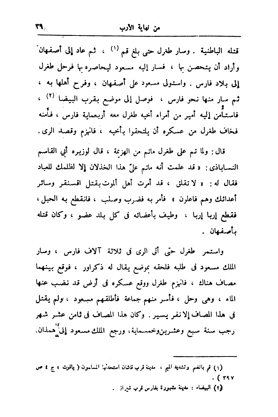 قتله الباطنية. وسار طغرل حتى بلغ قم «1» ، ثم عاد إلى أصفهان وأراد أن يتحصن بها، فسار إليه مسعود ليحاصره بها فرحل طغرل إلى بلاد فارس. واستولى مسعود على أصفهان، وفرح أهلها به، ثم سار منها نحو فارس، فوصل إلى موضع بقرب البيضا «2» ، فاستأمن إليه أمير من أمراء أخيه طغرل معه أربعماية فارس، فأمنه فخاف طغرل من عسكره أن يلتحقوا بأخيه، فانهزم وقصد الرى.