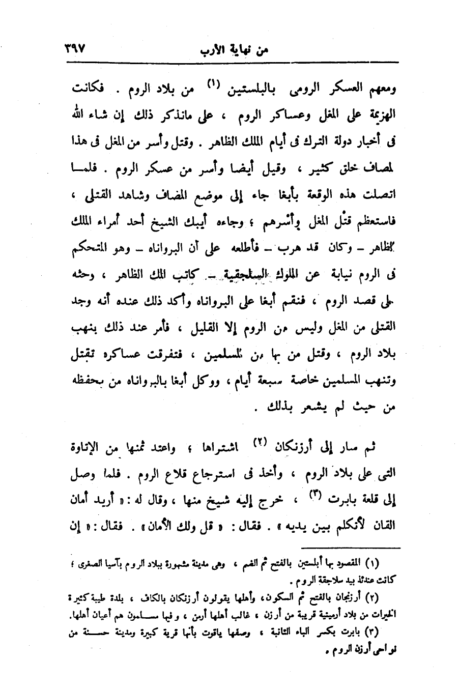 ومعهم العسكر الرومى بالبلستين «1» من بلاد الروم. فكانت الهزيمة على المغل وعساكر الروم، على ما نذكر ذلك إن شاء الله فى أخبار دولة الترك فى أيام الملك الظاهر. وقتل وأسر من المغل فى هذا لمصاف خلق كثير، وقيل أيضا وأسر من عسكر الروم. فلما اتصلت هذه الوقعة بأبغا جاء إلى موضع المضاف وشاهد القتلى، فاستعظم قتل المغل وأسرهم؛ وجاءه أيبك الشيخ أحد أمراء الملك الظاهر- وكان قد هرب- فأطلعه على أن البرواناه- وهو المتحكم فى الروم نيابة عن الملوك السلجقية- كاتب المك الظاهر، وحثه الى قصد الروم، فنقم أبغا على البرواناه وأكد ذلك عنده أنه وجد القتلى من المغل وليس من الروم إلا القليل، فأمر عند ذلك بنهب بلاد الروم، وقتل من بها من المسلمين، فتفرقت عساكره تقتل وتنهب المسلمين خاصة سبعة أيام، ووكل أبغا بالبرواناه من يحفظه من حيث لم يشعر بذلك.
