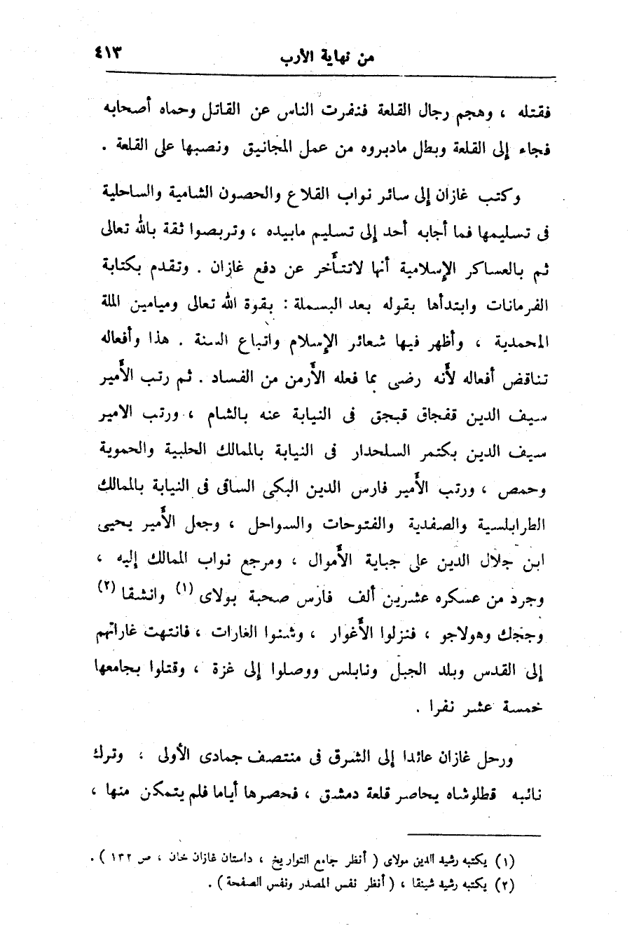 وكتب غازان إلى سائر نواب القلاع والحصون الشامية والساحلية فى تسليمها فما أجابه أحد إلى تسليم ما بيده، وتربصوا ثقة بالله تعالى ثم بالعساكر الإسلامية أنها لا تتأخر عن دفع غازان. وتقدم بكتابة الفرمانات وابتدأها بقوله بعد البسملة: بقوة الله تعالى وميامين الملة المحمدية، وأظهر فيها شعائر الإسلام واتباع السنة. هذا وأفعاله تناقض أفعاله لأنه رضى بما فعله الأرمن من الفساد. ثم رتب الأمير سيف الدين قفجاق قبجق فى النيابة عنه بالشام، ورتب الامير سيف الدين بكتمر السلحدار فى النيابة بالممالك الحلبية والحموية وحمص، ورتب الأمير فارس الدين البكى الساقى فى النيابة بالممالك الطرابلسية والصفدية والفتوحات والسواحل، وجعل الأمير يحيى ابن جلال الدين على جباية الأموال، ومرجع نواب الممالك إليه، وجرد من عسكره عشرين ألف فارس صحبة بولاى «1» وانشقا «2» وججك وهولاجو، فنزلوا الأغوار، وشنوا الغارات، فانتهت غاراتهم إلى القدس وبلد الجبل ونابلس ووصلوا إلى غزة، وقتلوا بجامعها خمسة عشر نفرا.