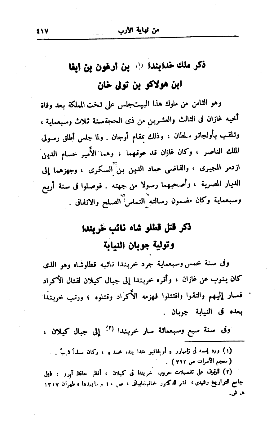 وهو الثامن من ملوك هذا البيت جلس على تخت المملكة بعد وفاة أخيه غازان فى الثالث والعشرين من ذى الحجة سنة ثلاث وسبعماية، وتلقب بأولجاتو سلطان، وذلك بمقام أوجان. ولما جلس أطلق رسولى الملك الناصر، وكان غازان قد عوقهما؛ وهما الأمير حسام الدين ازدمر المجيرى، والقاضى عماد الدين بن السكرى، وجهزهما إلى الديار المصرية، وأصحبهما رسولا من جهته. فوصلوا فى سنة أربع وسبعماية وكان مضمون رسالته التماس الصلح والاتفاق.