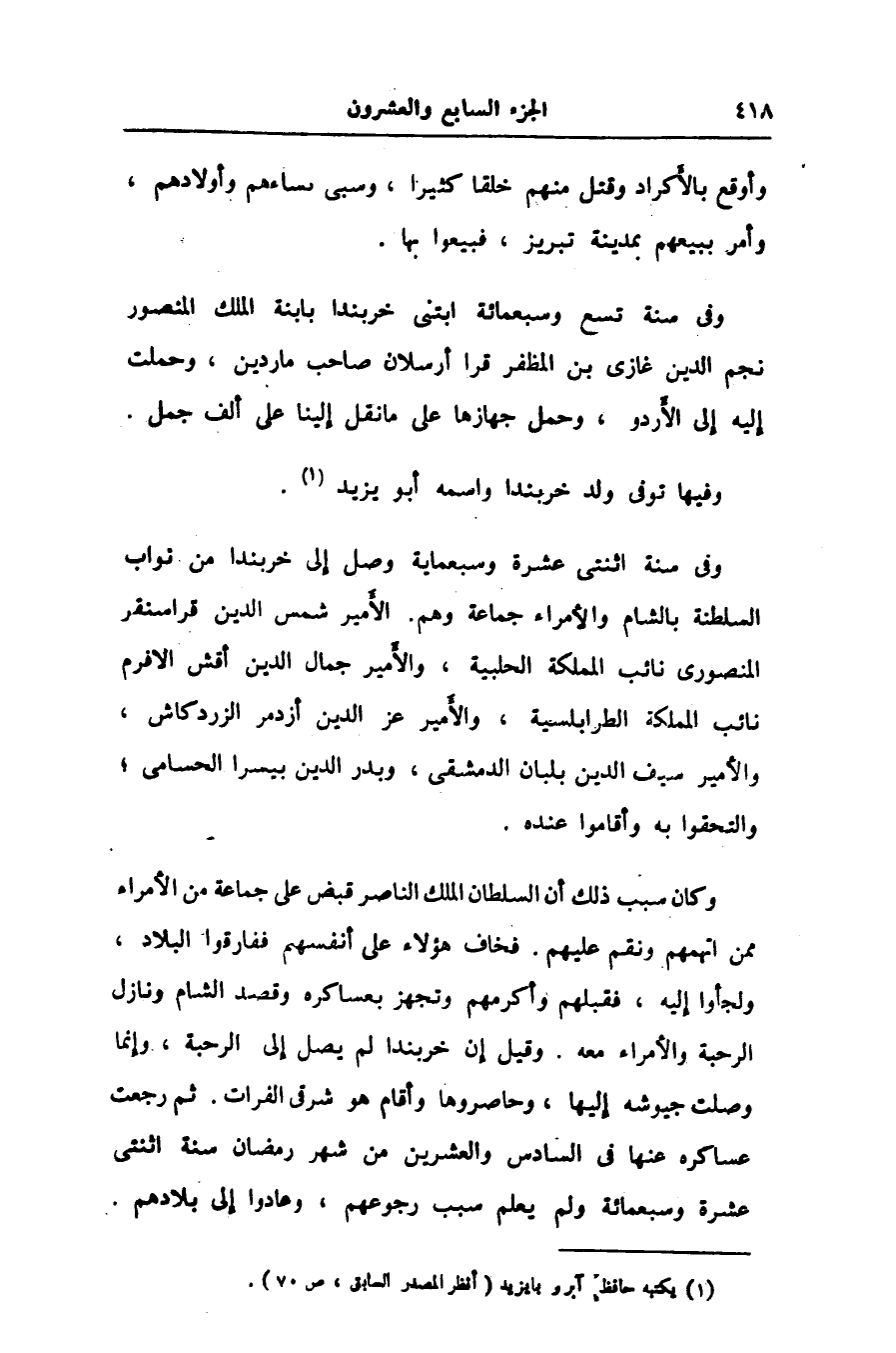 وفى سنة تسع وسبعمائة ابتنى خربندا بابنة الملك المنصور نجم الدين غازى بن المظفر قرا أرسلان صاحب ماردين، وحملت إليه إلى الأردو، وحمل جهازها على ما نقل إلينا على ألف جمل.