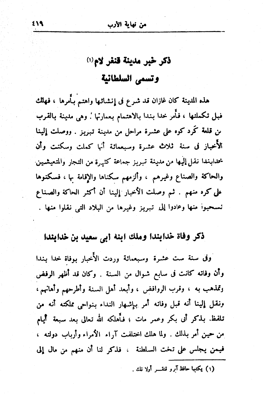 هذه المدينة كان غازان قد شرع فى إنشائها واهتم بأمرها، فهلك قبل تكملتها، فأمر خدابندا بالاهتمام بعمارتها. وهى مدينة بالقرب من قلعة كردكوه على عشرة مراحل من مدينة تبريز. ووصلت إلينا الأخبار فى سنة ثلاث عشرة وسبعمائة أنها كملت وسكنت وأن خدابندا نقل إليها من مدينة تبريز جماعة كثيرة من التجار والمتعيشين والحاكة والصناع وغيرهم، وألزمهم سكناها والإقامة بها، فسكنوها على كره منهم. ثم وصلت الأخبار إلينا أن أكثر الحاكة والصناع نسحبوا منها وعادوا إلى تبريز وغيرها من البلاد التى نقلوا منها.