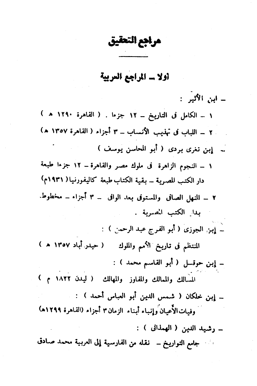 1- النجوم الزاهرة فى ملوك مصر والقاهرة- 12 جزءا طبعة دار الكتب المصرية- بقية الكتاب طبعة كاليفورنيا (1931 م)