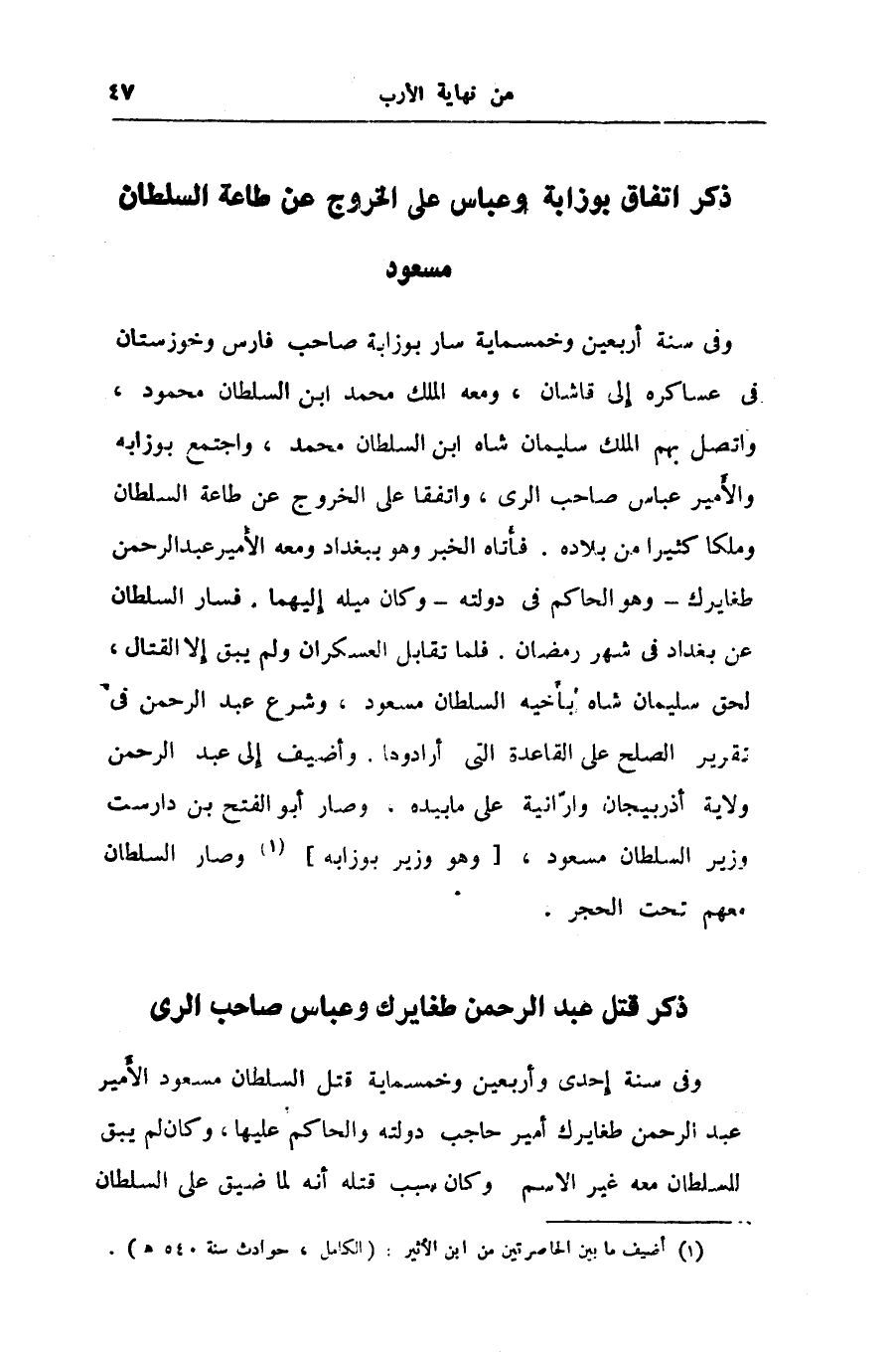 وفى سنة أربعين وخمسماية سار بوزابة صاحب فارس وخوزستان فى عساكره إلى قاشان، ومعه الملك محمد ابن السلطان محمود، واتصل بهم الملك سليمان شاه ابن السلطان محمد، واجتمع بوزابه والأمير عباس صاحب الرى، واتفقا على الخروج عن طاعة السلطان وملكا كثيرا من بلاده. فأتاه الخبر وهو ببغداد ومعه الأمير عبد الرحمن طغايرك- وهو الحاكم فى دولته- وكان ميله إليهما. فسار السلطان عن بغداد فى شهر رمضان. فلما تقابل العسكران ولم يبق إلا القتال، لحق سليمان شاه بأخيه السلطان مسعود، وشرع عبد الرحمن فى تقرير الصلح على القاعدة التى أرادوها. وأضيف إلى عبد الرحمن ولاية أذربيجان وارّانية على ما بيده، وصار أبو الفتح بن دارست وزير السلطان مسعود، [وهو وزير بوزابه] «1» وصار السلطان معهم تحت الحجر.