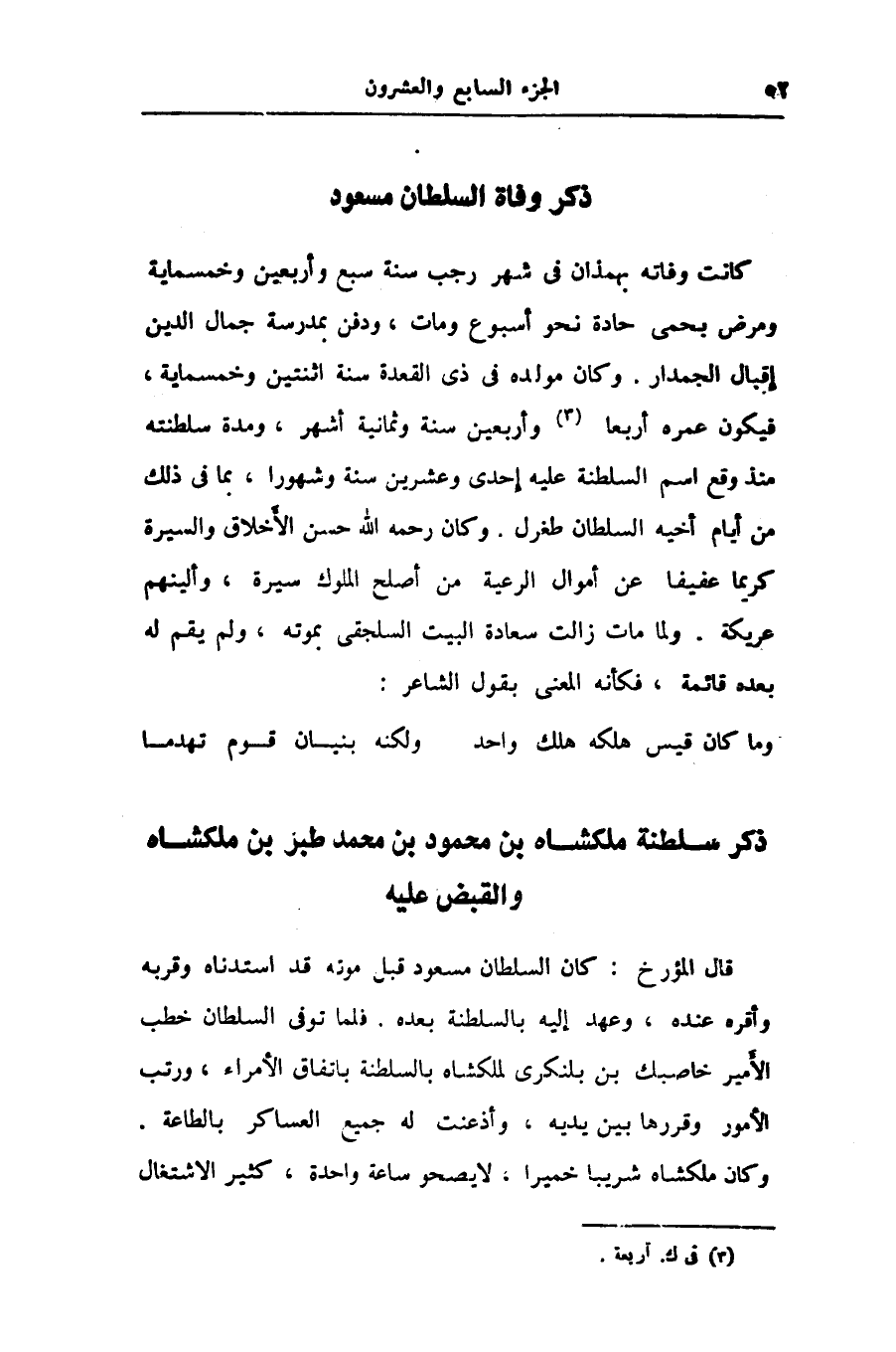 ذكر سلطنة ملكشاه بن محمود بن محمد طبر بن ملكشاه والقبض عليه