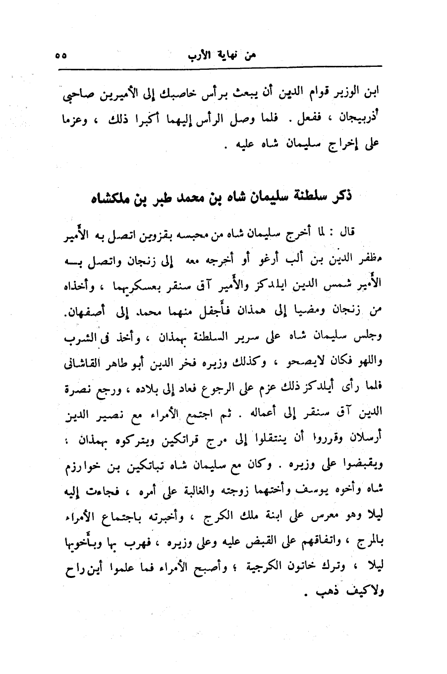وجلس سليمان شاه على سرير السلطنة بهمذان، وأخذ فى الشرب واللهو فكان لا يصحو، وكذلك وزيره فخر الدين أبو طاهر القاشانى فلما رأى أيلدكز ذلك عزم على الرجوع فعاد إلى بلاده، ورجع نصرة الدين آق سنقر إلى أعماله. ثم اجتمع الأمراء مع نصير الدين أرسلان وقرروا أن ينتقلوا إلى مرج قراتكين ويتركوه بهمذان، ويقبضوا على وزيره. وكان مع سليمان شاه تباتكين بن خوارزم شاه وأخوه يوسف وأختهما زوجته والغالبة على أمره، فجاءت إليه ليلا وهو معرس على ابنة ملك الكرج، وأخبرته باجتماع الأمراء بالمرج، واتفاقهم على القبض عليه وعلى وزيره، فهرب بها وبأخويها ليلا، وترك خاتون الكرجية؛ وأصبح الأمراء فما علموا أين راح ولا كيف ذهب.