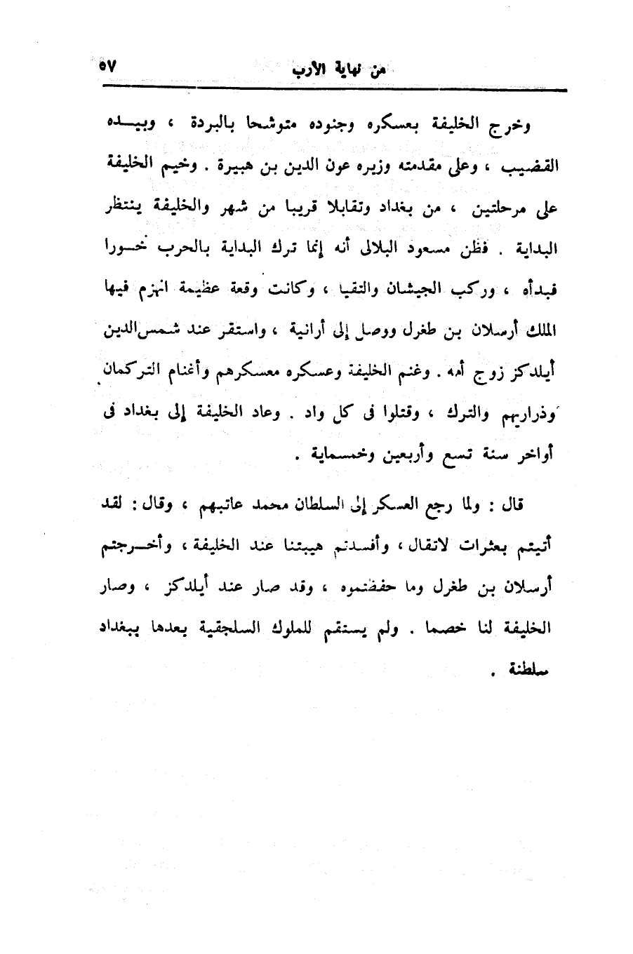 قال: ولما رجع العسكر إلى السلطان محمد عاتبهم، وقال: لقد أتيتم بعثرات لا تقال، وأفسدتم هيبتنا عند الخليفة، وأخرجتم أرسلان بن طغرل وما حفظتموه، وقد صار عند أيلدكز، وصار الخليفة لنا خصما. ولم يستقم للملوك السلجقية بعدها ببغداد سلطنة.
