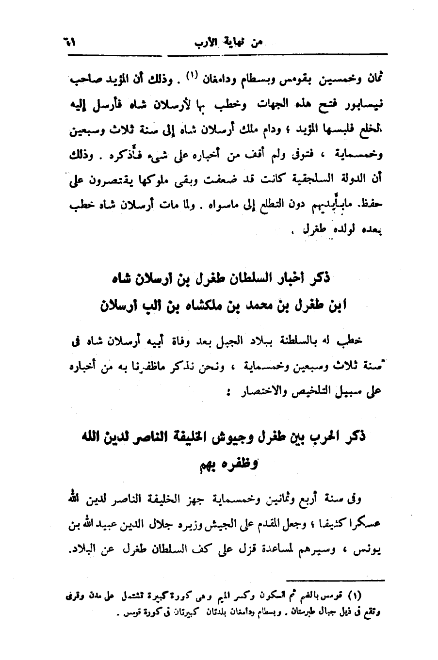 ثمان وخمسين بقومس وبسطام ودامغان «1» . وذلك أن المؤيد صاحب نيسابور فتح هذه الجهات وخطب بها لأرسلان شاه فأرسل إليه الخلع فلبسها المؤيد؛ ودام ملك أرسلان شاه إلى سنة ثلاث وسبعين وخمسماية، فتوفى ولم أقف من أخباره على شىء فأذكره. وذلك أن الدولة السلجقية كانت قد ضعفت وبقى ملوكها يقتصرون على حفظ ما بأيديهم دون التطلع إلى ما سواه. ولما مات أرسلان شاه خطب بعده لولده طغرل.
