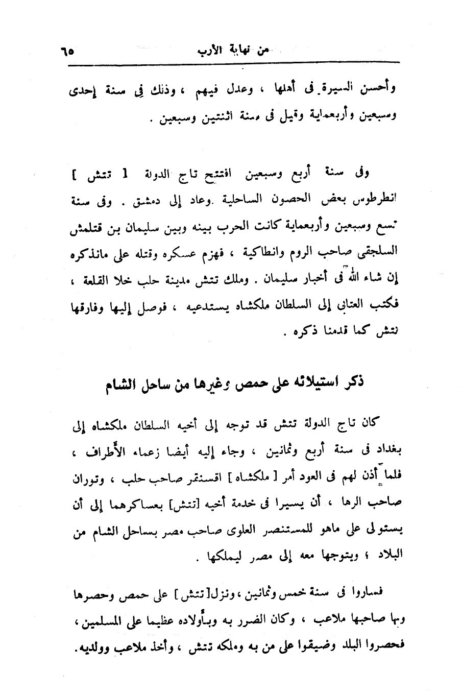 وفى سنة أربع وسبعين افتتح تاج الدولة [تتش] انطرطوس بعض الحصون الساحلية وعاد إلى دمشق. وفى سنة تسع وسبعين وأربعماية كانت الحرب بينه وبين سليمان بن قتلمش السلجقى صاحب الروم وانطاكية، فهزم عسكره وقتله على ما نذكره إن شاء الله فى أخبار سليمان. وملك تتش مدينة حلب خلا القلعة، فكتب العتابى إلى السلطان ملكشاه يستدعيه، فوصل إليها وفارقها تتش كما قدمنا ذكره.