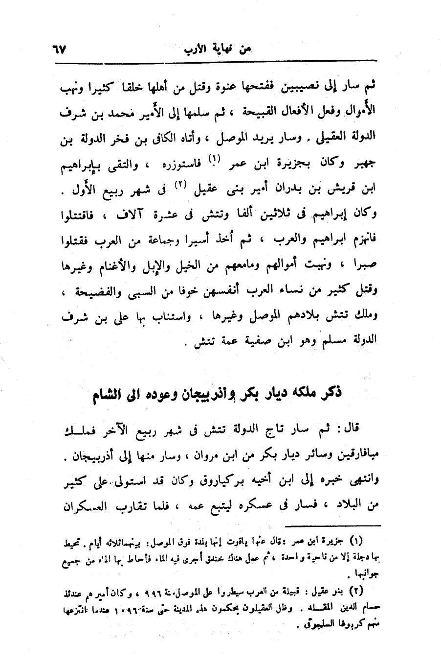 وكان إبراهيم فى ثلاثين ألفا وتتش فى عشرة آلاف، فاقتتلوا فانهزم ابراهيم والعرب، ثم اخذ أسيرا وجماعة من العرب فقتلوا صبرا، ونهبت أموالهم وما معهم من الخيل والإبل والأغنام وغيرها وقتل كثير من نساء العرب أنفسهن خوفا من السبى والفضيحة، وملك تتش بلادهم الموصل وغيرها، واستناب بها على بن شرف الدولة مسلم وهو ابن صفية عمة تتش.