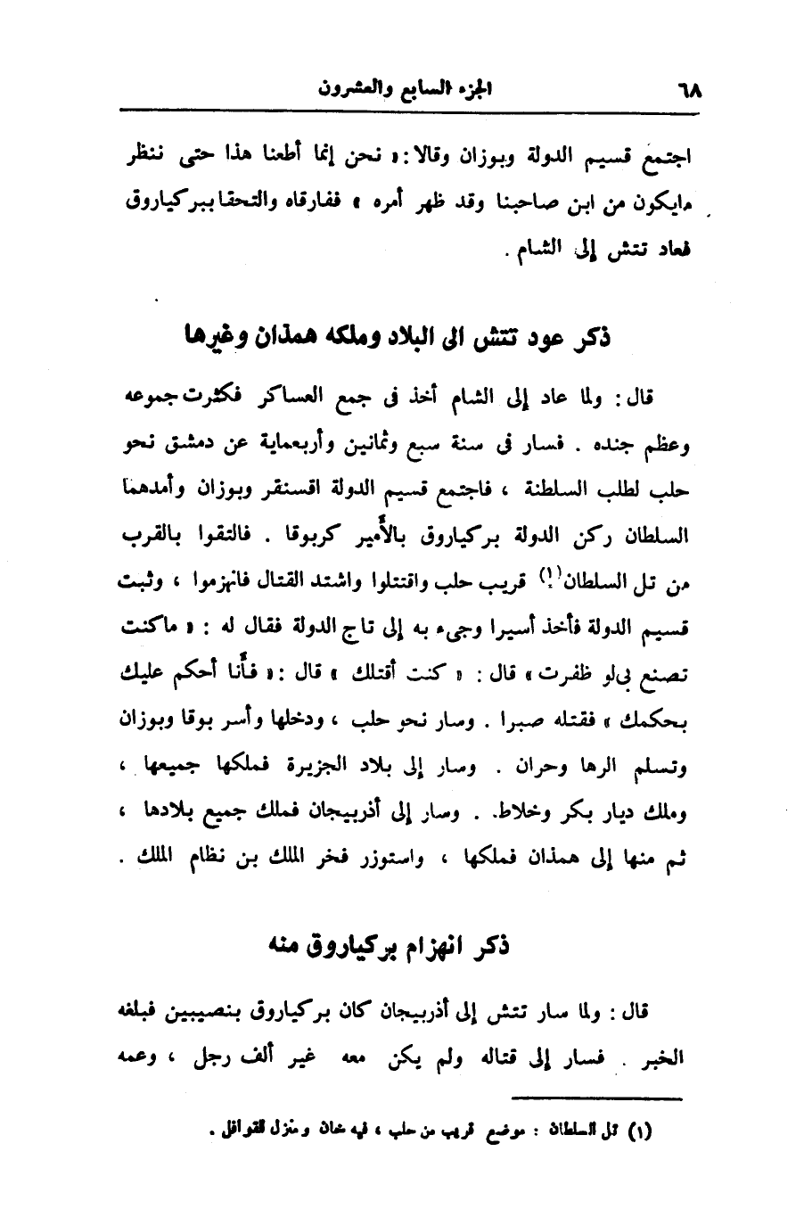 قال: ولما سار تتش إلى أذربيجان كان بركياروق بنصيبين فبلغه الخبر. فسار إلى قتاله ولم يكن معه غير ألف رجل، وعمه