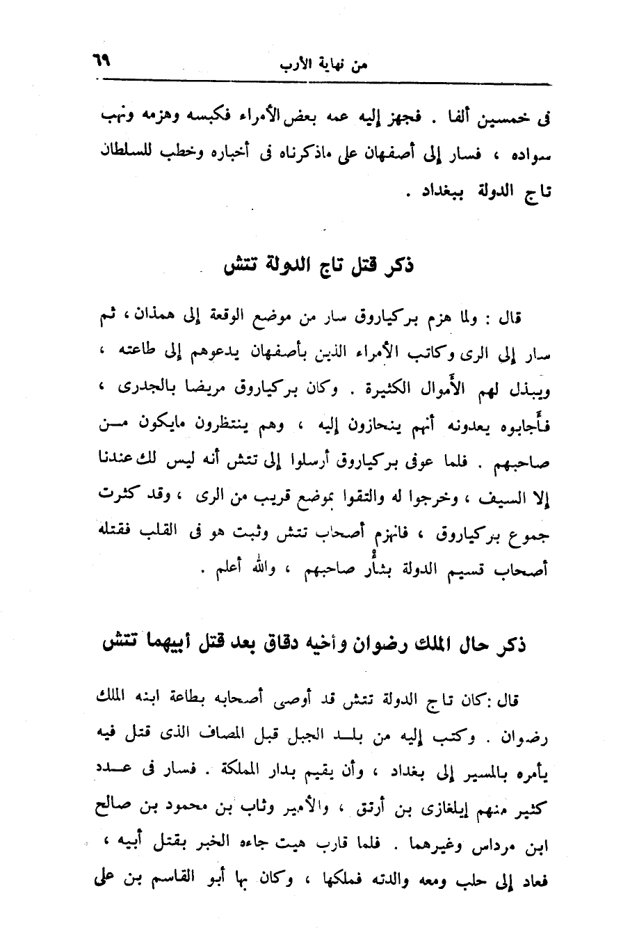 قال: ولما هزم بركياروق سار من موضع الوقعة إلى همذان، ثم سار إلى الرى وكاتب الأمراء الذين بأصفهان يدعوهم إلى طاعته، ويبذل لهم الأموال الكثيرة. وكان بركياروق مريضا بالجدرى، فأجابوه يعدونه أنهم ينحازون إليه، وهم ينتظرون ما يكون من صاحبهم. فلما عوفى بركياروق أرسلوا إلى تتش أنه ليس لك عندنا إلا السيف، وخرجوا له والتقوا بموضع قريب من الرى، وقد كثرت جموع بركياروق، فانهزم أصحاب تتش وثبت هو فى القلب فقتله أصحاب قسيم الدولة بثأر صاحبهم، والله أعلم.