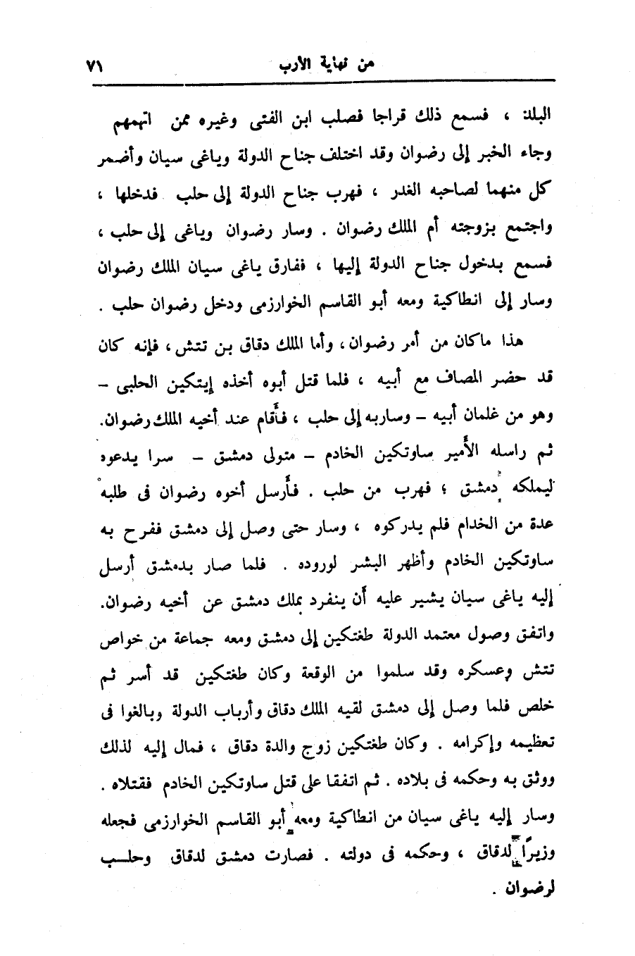 هذا ما كان من أمر رضوان، وأما الملك دقاق بن تتش، فإنه كان قد حضر المصاف مع أبيه، فلما قتل أبوه أخذه إيتكين الحلبى- وهو من غلمان أبيه- وسار به إلى حلب، فأقام عند أخيه الملك رضوان.