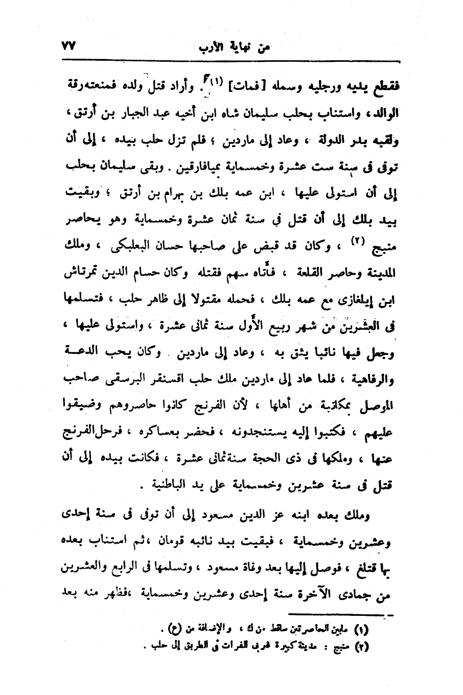 فقطع يديه ورجليه وسمله [فمات] «1» . وأراد قتل ولده فمنعته رقة الوالد، واستناب بحلب سليمان شاه ابن أخيه عبد الجبار بن أرتق، ولقبه بدر الدولة، وعاد إلى ماردين؛ فلم تزل حلب بيده، إلى أن توفى فى سنة ست عشرة وخمسماية بميافارقين. وبقى سليمان بحلب إلى أن استولى عليها، ابن عمه بلك بن بهرام بن أرتق؛ وبقيت بيد بلك إلى أن قتل فى سنة ثمان عشرة وخمسماية وهو يحاصر منبج «2» ، وكان قد قبض على صاحبها حسان البعلبكى، وملك المدينة وحاصر القلعة، فأتاه سهم فقتله وكان حسام الدين تمرتاش ابن إيلغازى مع عمه بلك، فحمله مقتولا إلى ظاهر حلب، فتسلمها فى العشرين من شهر ربيع الأول سنة ثمانى عشرة، واستولى عليها، وجعل فيها نائبا يثق به، وعاد إلى ماردين. وكان يحب الدعة والرفاهية، فلما عاد إلى ماردين ملك حلب اقسنقر البرسقى صاحب الموصل بمكاتبة من أهلها، لأن الفرنج كانوا حاصروهم وضيقوا عليهم، فكتبوا إليه يستنجدونه، فحضر بعساكره، فرحل الفرنج عنها، وملكها فى ذى الحجة سنة ثمانى عشرة، فكانت بيده إلى أن قتل فى سنة عشرين وخمسماية على يد الباطنية.