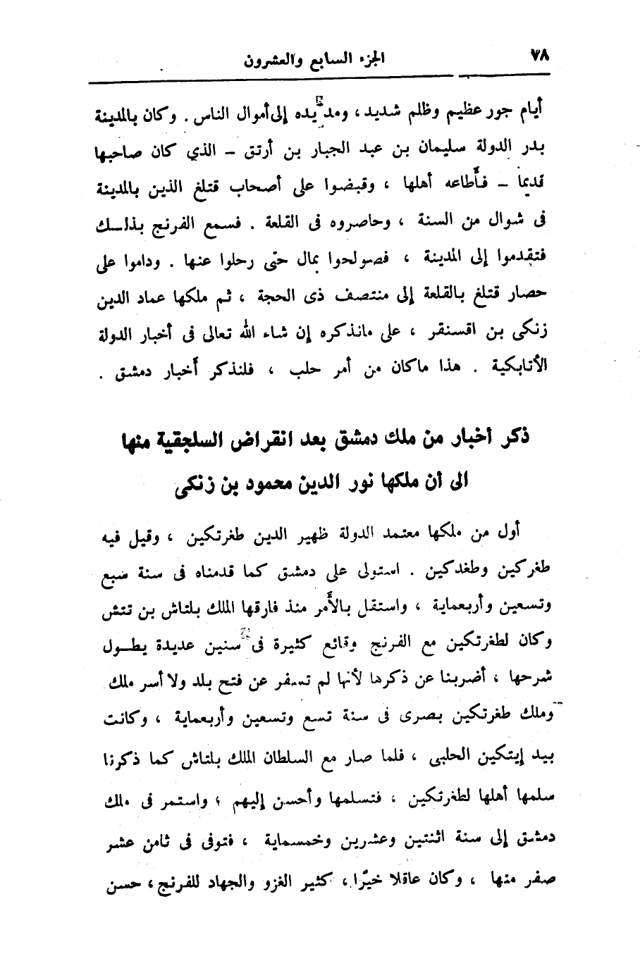 أيام جور عظيم وظلم شديد، ومديده إلى أموال الناس. وكان بالمدينة بدر الدولة سليمان بن عبد الجبار بن أرتق- الذى كان صاحبها قديما- فأطاعه أهلها، وقبضوا على أصحاب قتلغ الذين بالمدينة فى شوال من السنة، وحاصروه فى القلعة. فسمع الفرنج بذلك فتقدموا إلى المدينة، فصولحوا بمال حتى رحلوا عنها. وداموا على حصار قتلغ بالقلعة إلى منتصف ذى الحجة، ثم ملكها عماد الدين زنكى بن اقسنقر، على ما نذكره إن شاء الله تعالى فى أخبار الدولة الأتابكية. هذا ما كان من أمر حلب، فلنذكر أخبار دمشق.