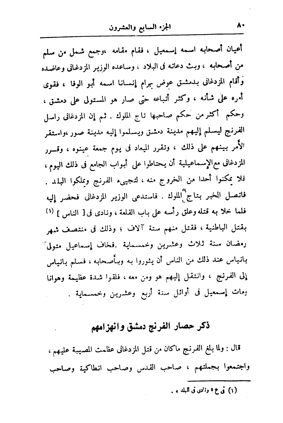 أعيان أصحابه اسمه إسمعيل، فقام مقامه، وجمع شمل من سلم من أصحابه، وبث دعاته فى البلاد، وساعده الوزير المزدغانى وعاضده وأقام المزدغانى بدمشق عوض بهرام إنسانا اسمه أبو الوفا، فقوى أمره على شأنه، وكثر أتباعه حتى صار هو المستولى على دمشق، وحكم أكثر من حكم صاحبها تاج الملوك. ثم إن المزدغانى راسل الفرنج ليسلم إليهم مدينة دمشق ويسلموا إليه مدينة صور، واستقر الأمر بينهم على ذلك، وتقرر الميعاد فى يوم جمعة عينوه، وقرر المزدغانى مع الإسماعيلية أن يحتاطوا على أبواب الجامع فى ذلك اليوم، فلا يمكنوا أحدا من الخروج منه، لتجيىء الفرنج ويملكوا البلد.