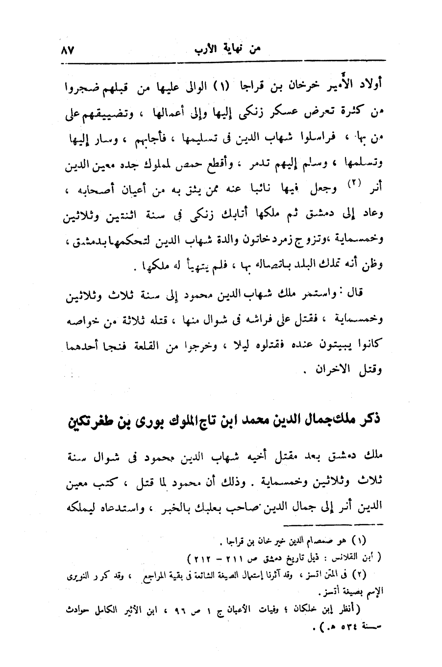 أولاد الأمير خرخان بن قراجا «1» الوالى عليها من قبلهم ضجروا من كثرة تعرض عسكر زنكى إليها وإلى أعمالها، وتضييقهم على من بها، فراسلوا شهاب الدين فى تسليمها، فأجابهم، وسار إليها وتسلمها، وسلم إليهم تدمر، وأقطع حمص لمملوك جده معين الدين أنر «2» وجعل فيها نائبا عنه ممن يثق به من أعيان أصحابه، وعاد إلى دمشق ثم ملكها أتابك زنكى فى سنة اثنتين وثلاثين وخمسماية، وتزوج زمرد خاتون والدة شهاب الدين لتحكمها بدمشق، وظن أنه تملك البلد باتصاله بها، فلم يتهيأ له ملكها.