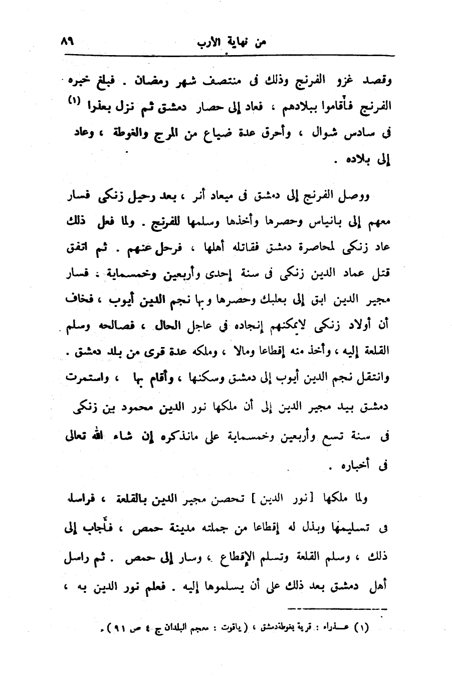 وانتقل نجم الدين أيوب إلى دمشق وسكنها، وأقام بها، واستمرت دمشق بيد مجير الدين إلى أن ملكها نور الدين محمود بن زنكى فى سنة تسع وأربعين وخمسماية على ما نذكره إن شاء الله تعالى فى أخباره.