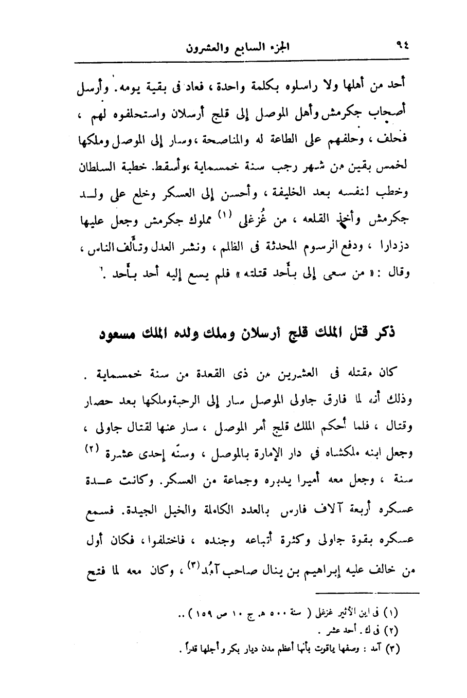 أحد من أهلها ولا راسلوه بكلمة واحدة، فعاد فى بقية يومه. وأرسل أصحاب جكرمش وأهل الموصل إلى قلج أرسلان واستحلفوه لهم، فحلف، وحلفهم على الطاعة له والمناصحة، وسار إلى الموصل وملكها لخمس بقين من شهر رجب سنة خمسماية، وأسقط خطبة السلطان وخطب لنفسه بعد الخليفة، وأحسن إلى العسكر وخلع على ولد جكرمش وأخذ القلعه، من غزغلى «1» مملوك جكرمش وجعل عليها دزدارا، ودفع الرسوم المحدثة فى الظلم، ونشر العدل وتألف الناس، وقال: «من سعى إلى بأحد قتلته» فلم يسع إليه أحد بأحد.