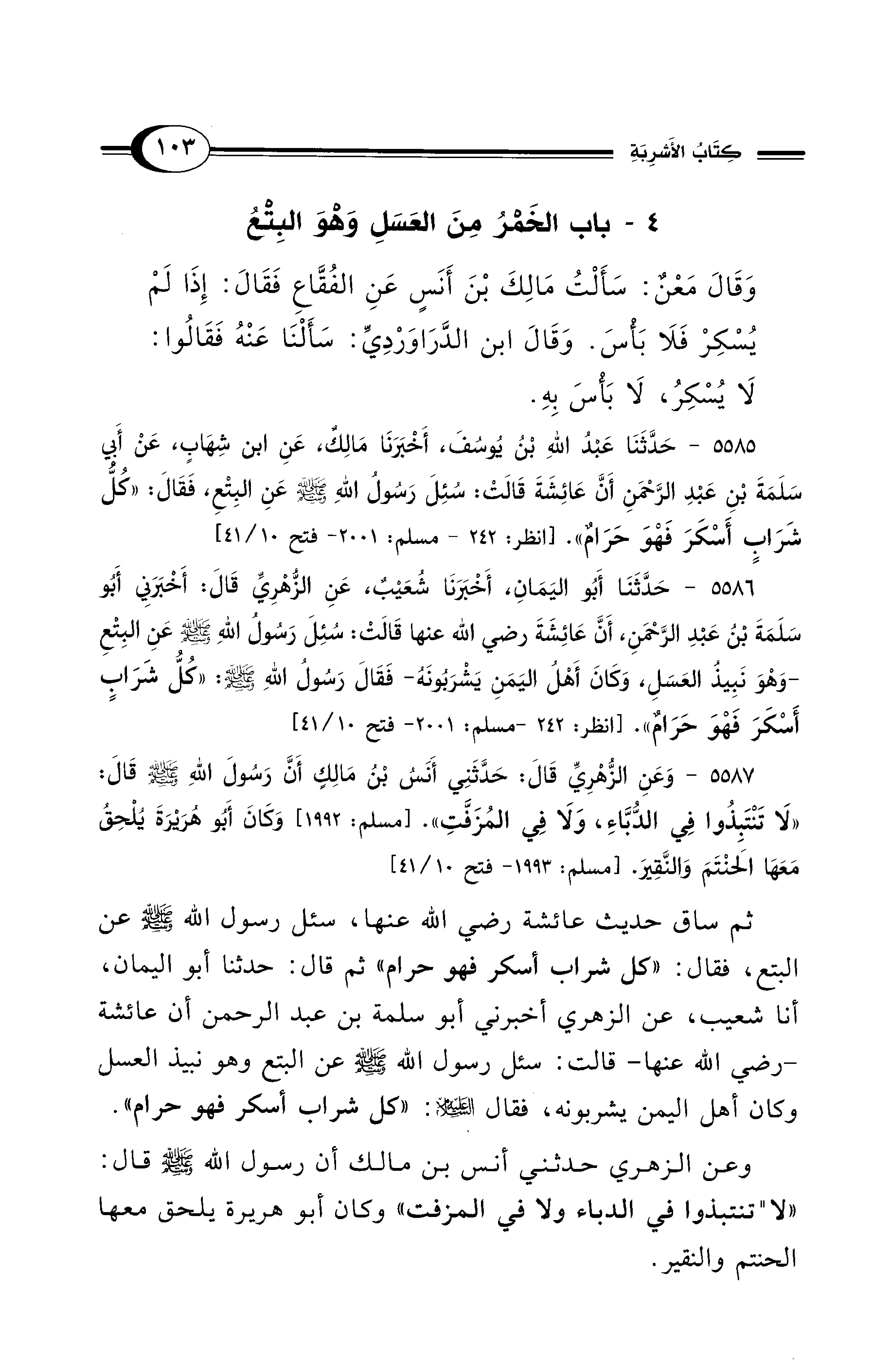 5587 - وَعَنِ الزُّهْرِيِّ قَالَ: حَدَّثَنِي أَنَسُ بْنُ مَالِكٍ أَنَّ رَسُولَ اللهِ - صلى الله عليه وسلم - قَالَ: «لاَ تَنْتَبِذُوا فِي الدُّبَّاءِ، وَلاَ فِي الْمُزَفَّتِ». [مسلم: 1992] وَكَانَ أَبُو هُرَيْرَةَ يُلْحِقُ مَعَهَا الْحَنْتَمَ وَالنَّقِيرَ. [مسلم: 1993 - فتح 10/ 41]