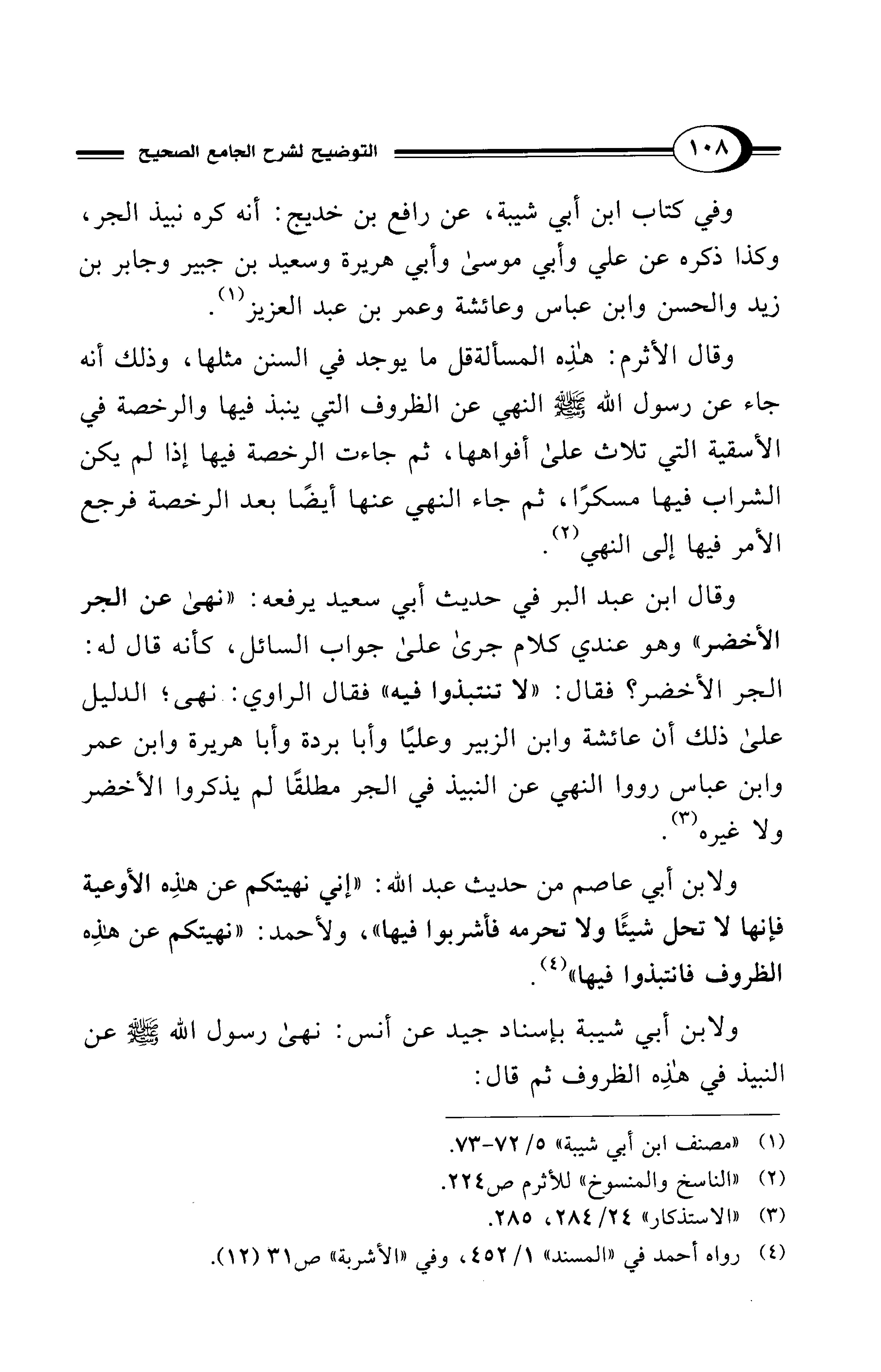 وقال ابن عبد البر في حديث أبي سعيد يرفعه: "نهى عن الجر الأخضر" وهو عندي كلام جرى على جواب السائل، كأنه قال له: الجر الأخضر؟ فقال: "لا تنتبذوا فيه" فقال الراوي: نهى؛ الدليل على ذلك أن عائشة وابن الزبير وعليًا وأبا بردة وأبا هريرة وابن عمر وابن عباس رووا النهي عن النبيذ في الجر مطلقًا لم يذكروا الأخضر ولا غيره (¬3).