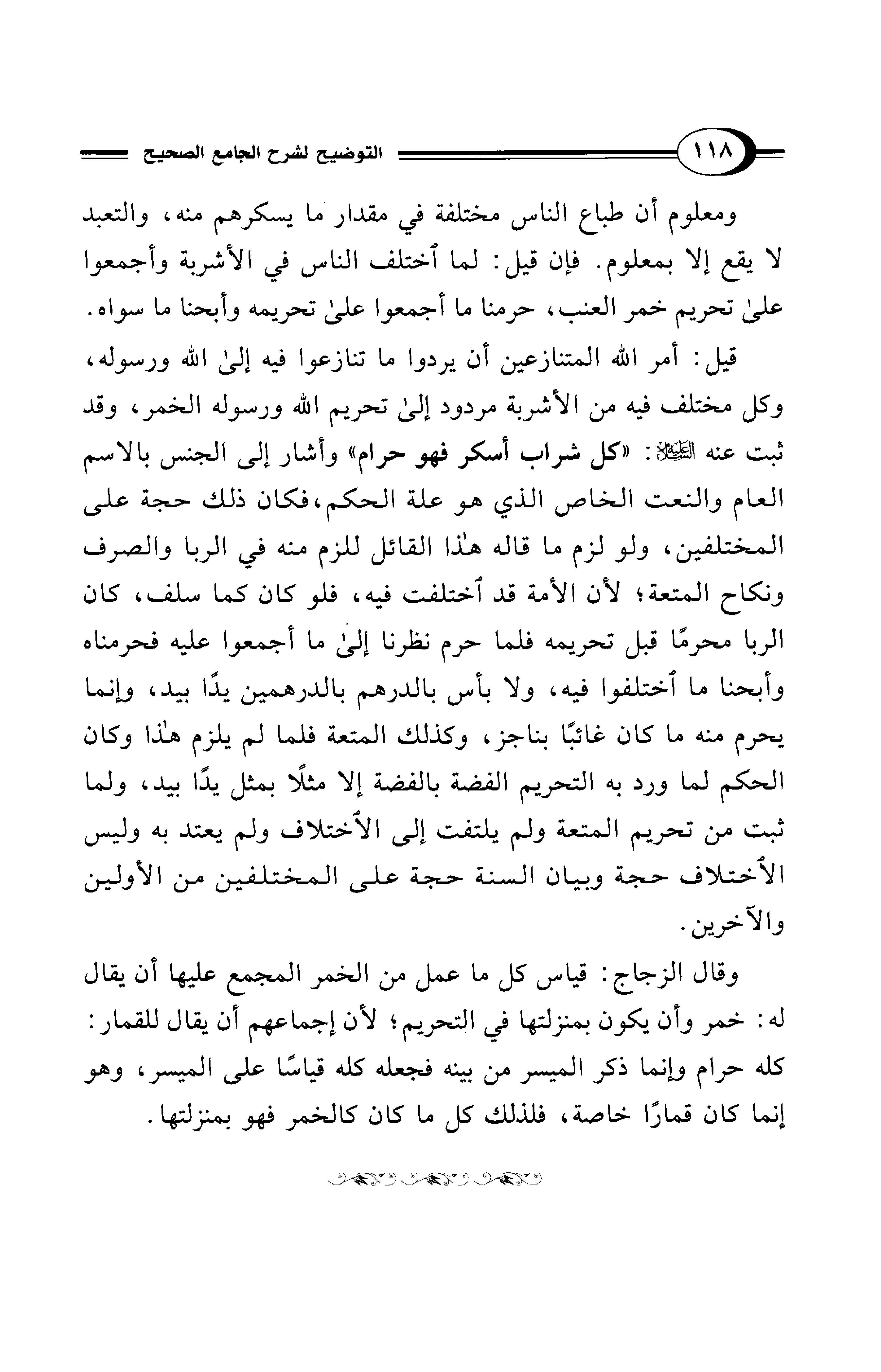 وقال الزجاج: قياس كل ما عمل من الخمر المجمع عليها أن يقال له: خمر وأن يكون بمنزلتها في التحريم؛ لأن إجماعهم أن يقال للقمار: كله حرام وإنما ذكر الميسر من بينه فجعله كله قياسًا على الميسر، وهو إنما كان قمارًا خاصة، فلذلك كل ما كان كالخمر فهو بمنزلتها.