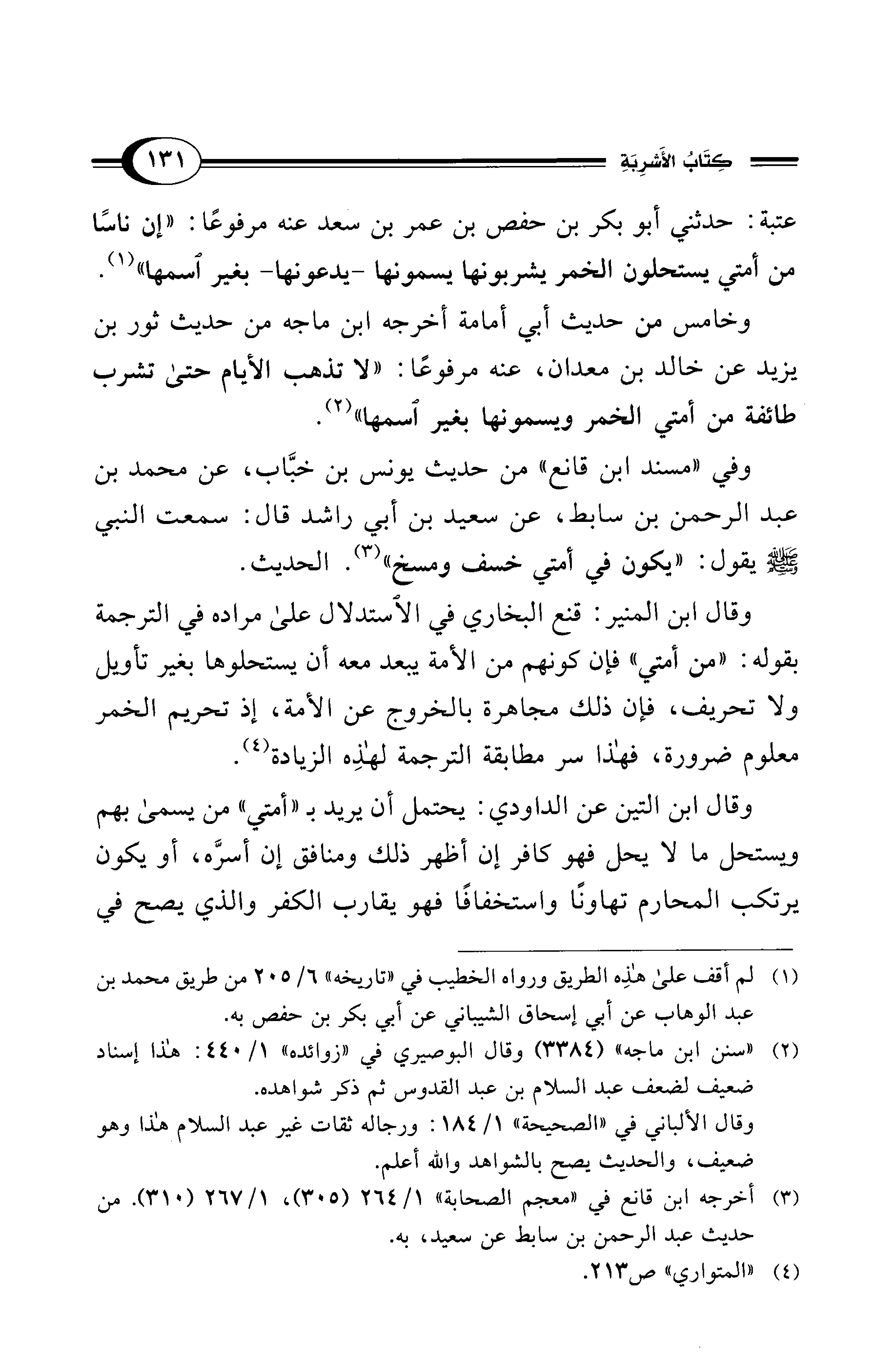 وخامس من حديث أبي أمامة أخرجه ابن ماجه من حديث ثور بن يزيد عن خالد بن معدان، عنه مرفوعًا: "لا تذهب الأيام حتى تشرب طائفة من أمتي الخمر ويسمونها بغير اسمها" (¬2).