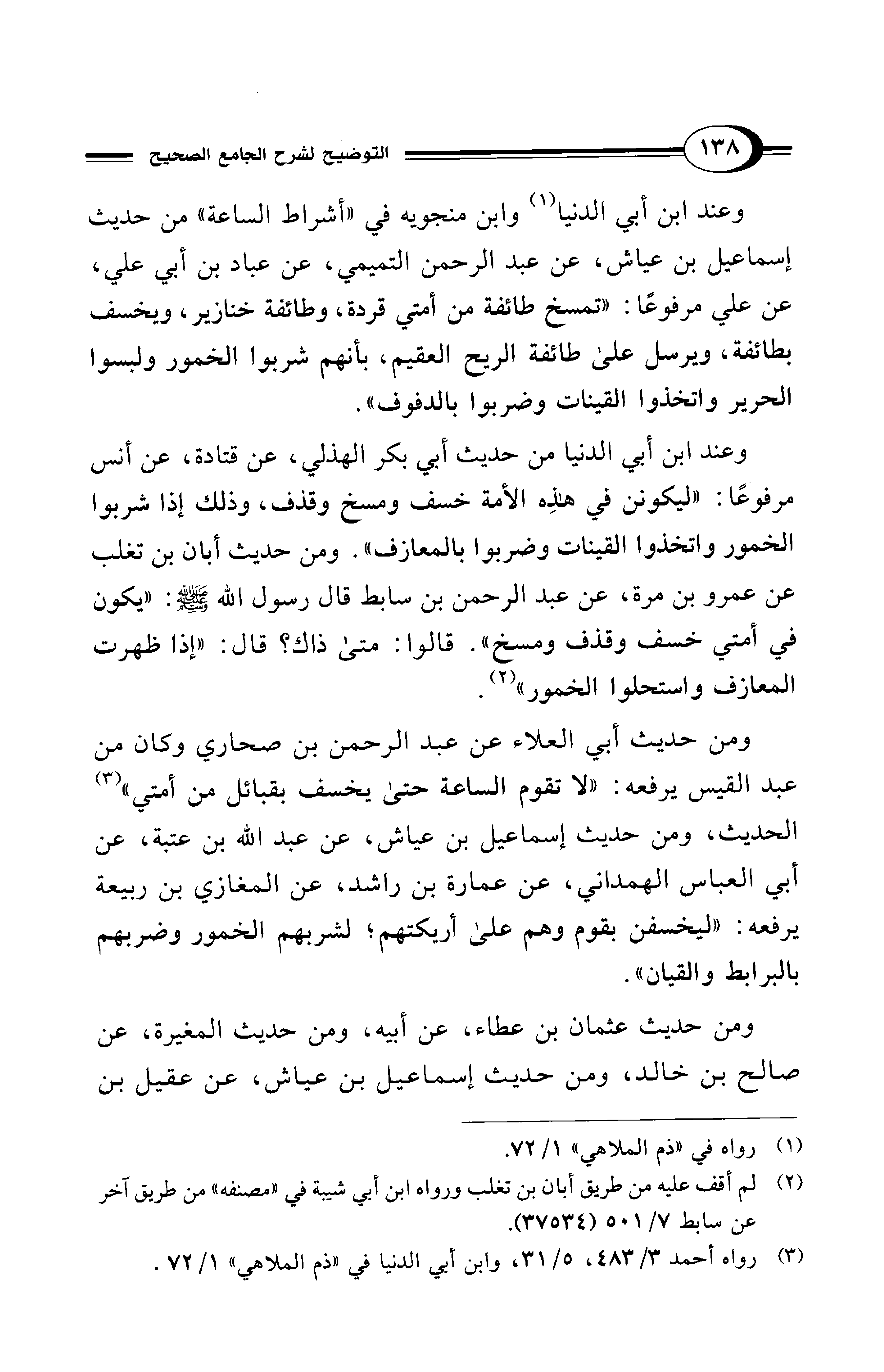 ومن حديث أبي العلاء عن عبد الرحمن بن صحاري وكان من عبد القيس يرفعه: "لا تقوم الساعة حتى يخسف بقبائل من أمتي" (¬3) الحديث، ومن حديث إسماعيل بن عياش، عن عبد الله بن عتبة، عن أبي العباس الهمداني، عن عمارة بن راشد، عن المغازي بن ربيعة يرفعه: "ليخسفن بقوم وهم على أريكتهم؛ لشربهم الخمور وضربهم بالبرابط والقيان".
