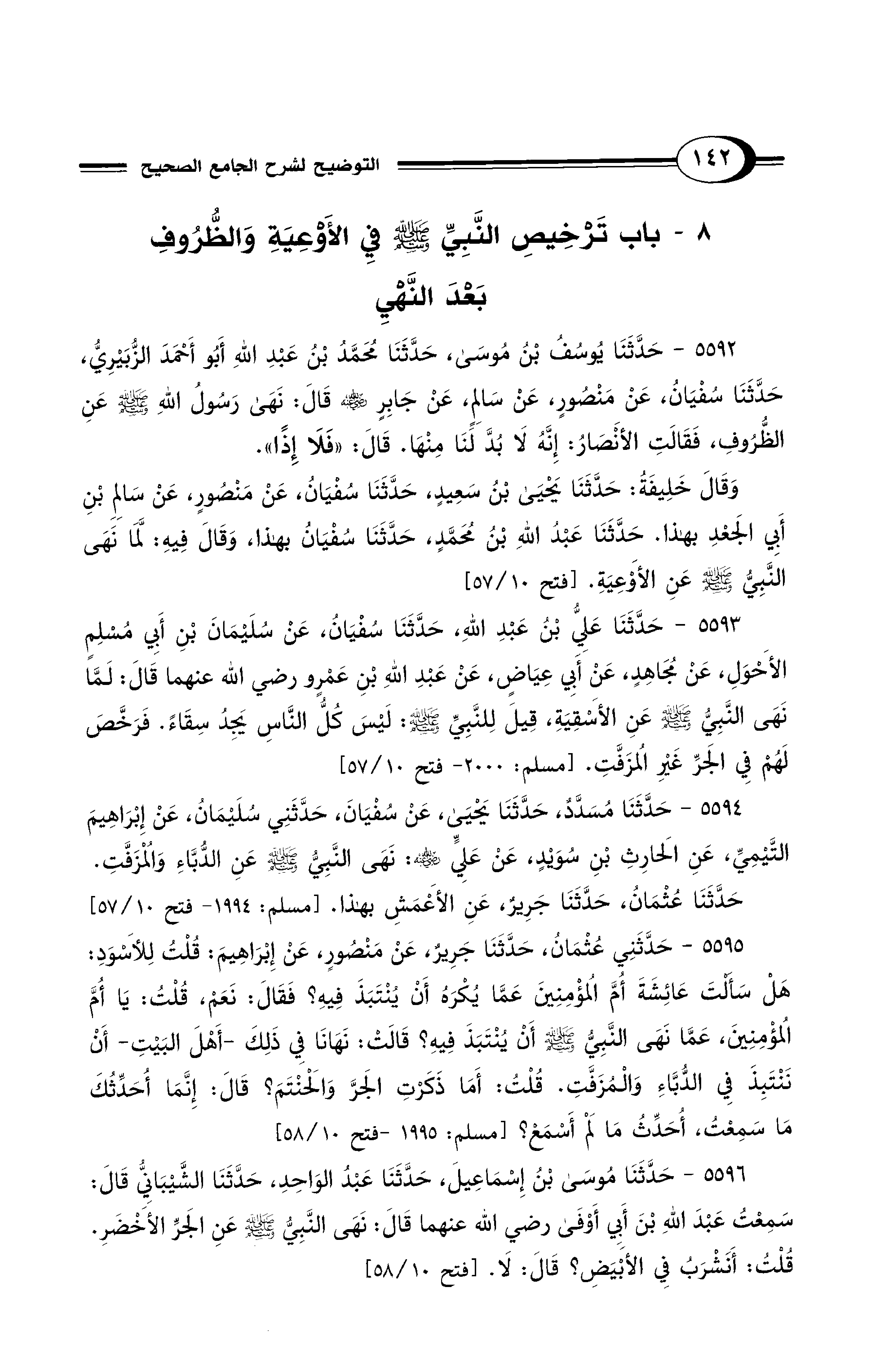5593 - حَدَّثَنَا عَلِيُّ بْنُ عَبْدِ اللهِ، حَدَّثَنَا سُفْيَانُ، عَنْ سُلَيْمَانَ بْنِ أَبِي مُسْلِمٍ الأَحْوَلِ، عَنْ مُجَاهِدٍ، عَنْ أَبِي عِيَاضٍ، عَنْ عَبْدِ اللهِ بْنِ عَمْرٍو - رضي الله عنهما -قَالَ: لَمَّا نَهَى النَّبِيُّ - صلى الله عليه وسلم - عَنِ الأَسْقِيَةِ، قِيلَ لِلنَّبِيِّ - صلى الله عليه وسلم -: لَيْسَ كُلُّ النَّاسِ يَجِدُ سِقَاءً. فَرَخَّصَ لَهُمْ فِي الْجَرِّ غَيْرِ الْمُزَفَّتِ. [مسلم: 2000 - فتح 10/ 57]